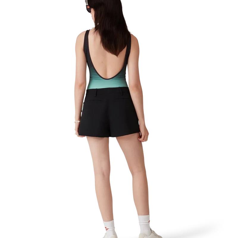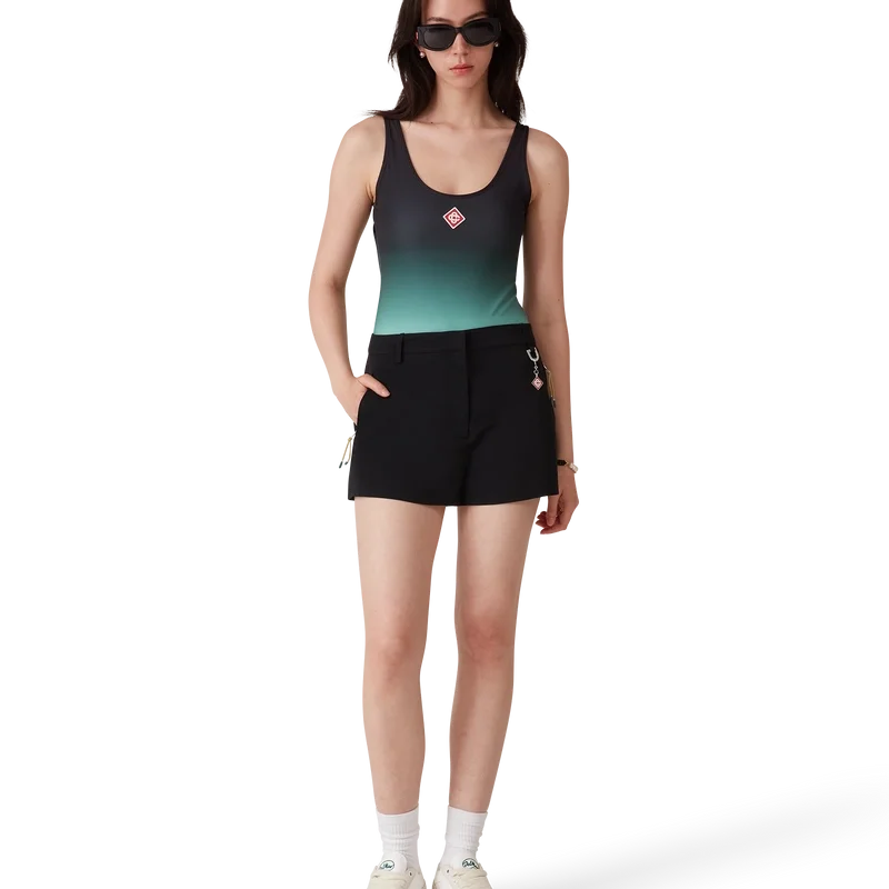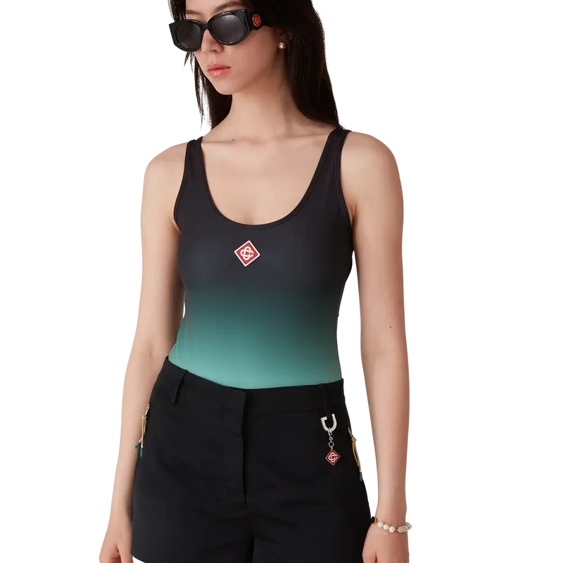 Der Gradient-Badeanzug ist ein bedrucktes Design aus atmungsaktivem, technischem Badestoff mit einem mintfarbenen Farbverlauf, der an die Farbgebung des Park Hyatt angelehnt ist – einem legendären Hotel in Tokio, dessen Inneneinrichtung Mint und Schwarz aufgreift. Abgerundet wird das Design durch hoch geschnittene Beine, einen U-Ausschnitt, einen Cut-Out am Rücken und das charakteristische Diamant-Logo des Hauses auf der Brust.