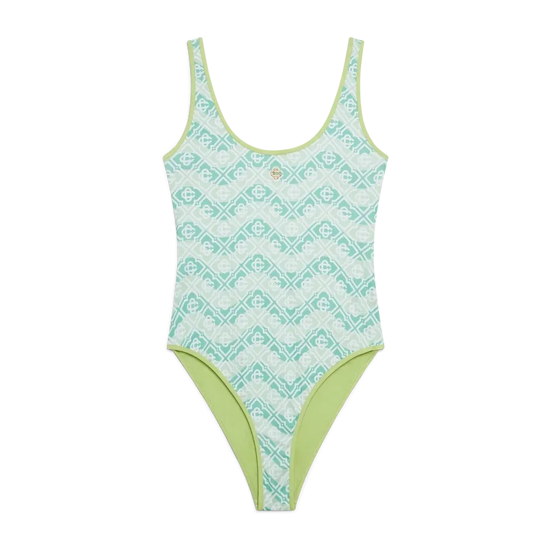 Der Badeanzug mit gewelltem Monogramm-Print besticht durch ein raffiniertes Design, bei dem das Monogramm-Muster des Hauses auf einem von Memphis-Waves inspirierten Hintergrund zur Geltung kommt. Abgerundet wird das Modell durch das charakteristische Rautenlogo des Hauses auf der Brust, hoch geschnittene Beine, einen Rundhalsausschnitt, einen tiefen Rückenausschnitt und kontrastierende Kanten.