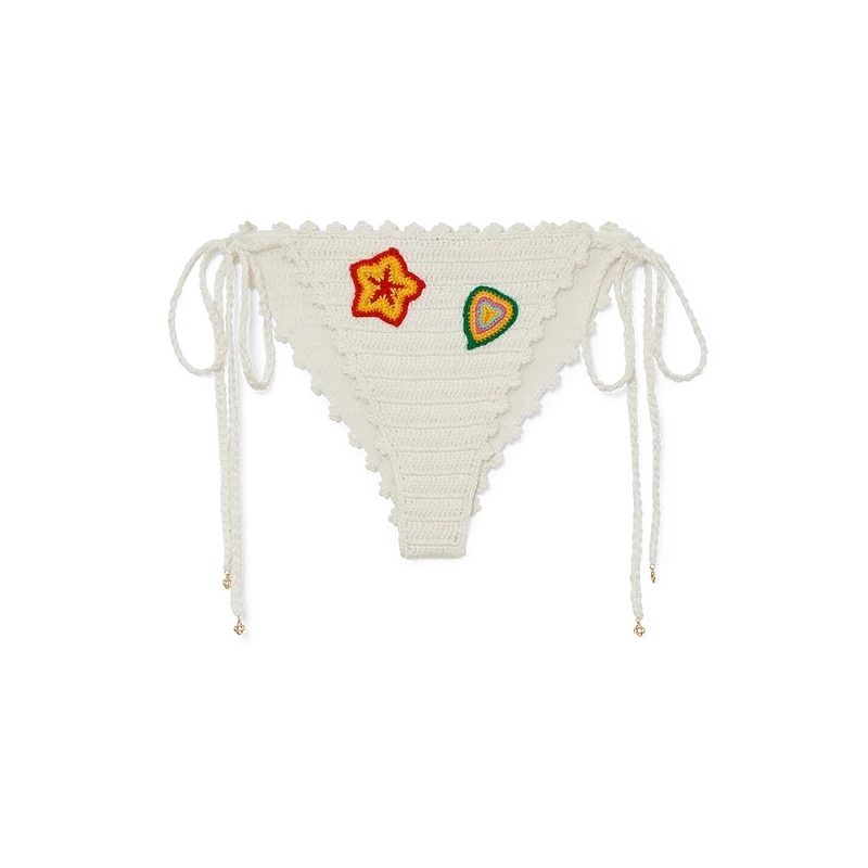 Das Bikini-Höschen mit Häkelmotiv ist aus Häkelstoff gefertigt. Es ist mit Motiven der klassischen Designelemente des Hauses verziert und verfügt über Bindebänder an den Hüften. Dieses Teil ist dazu gedacht, mit dem passenden Bikini-Oberteil getragen zu werden.