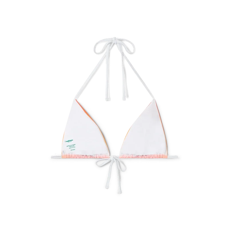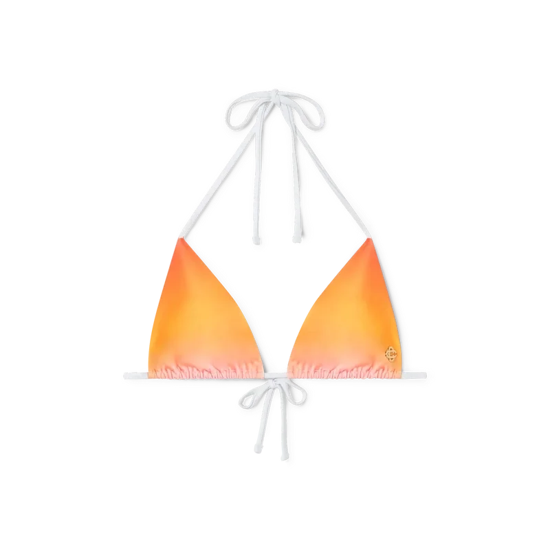 Das Bikini-Oberteil mit Farbverlauf ist ein bedrucktes Triangel-Modell aus einem Polyester-Mischgewebe, das die Farbverläufe dieser Saison aufgreift. Die Farbpalette dieser Kollektion ist hell und idealistisch und unterstreicht die für unsere Marke zentralen, ätherischen Themen. Abgerundet durch kontrastierende weiße Bänder zum Binden am Nacken und am Rücken, herausnehmbare Cup-Einlagen und die markentypische vergoldete, ineinander verschlungene CC-Niete am linken Cup – dieses Modell ist dazu gedacht, mit dem passenden Bikini-Höschen getragen zu werden.