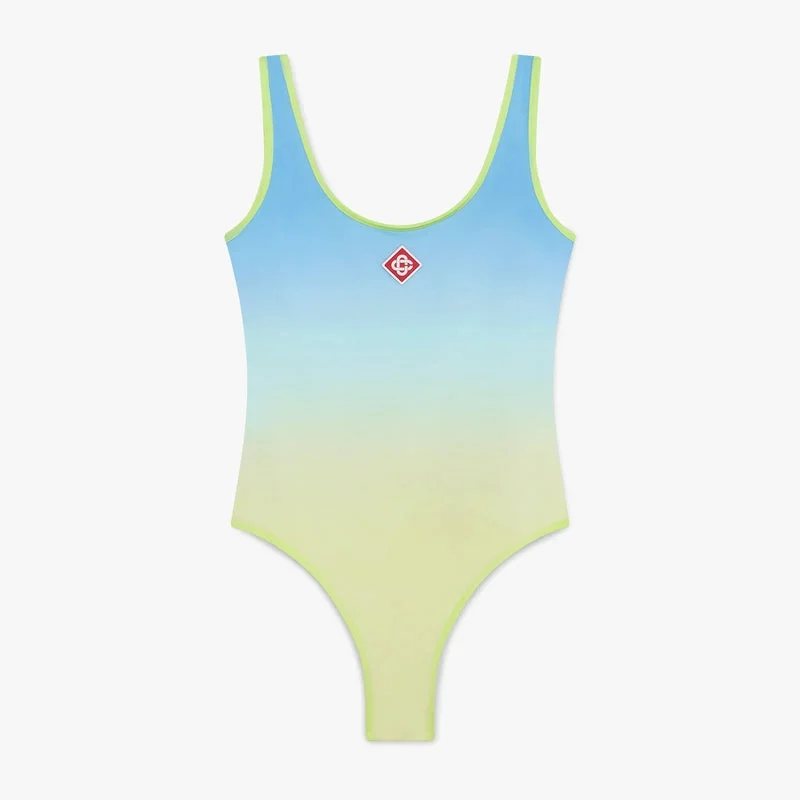 Der blau-gelbe Badeanzug mit Farbverlauf ist ein bedrucktes Einteiler-Design aus atmungsaktivem Stoff mit dem saisonalen Farbverlaufsmuster. Abgerundet wird er durch das charakteristische Rautenlogo des Hauses auf der Vorderseite, einen Rundhalsausschnitt, hoch geschnittene Beine, ein Futter und einen tief ausgeschnittenen Rückenausschnitt.