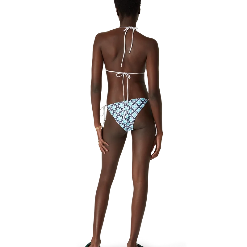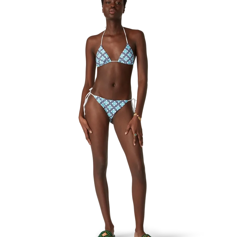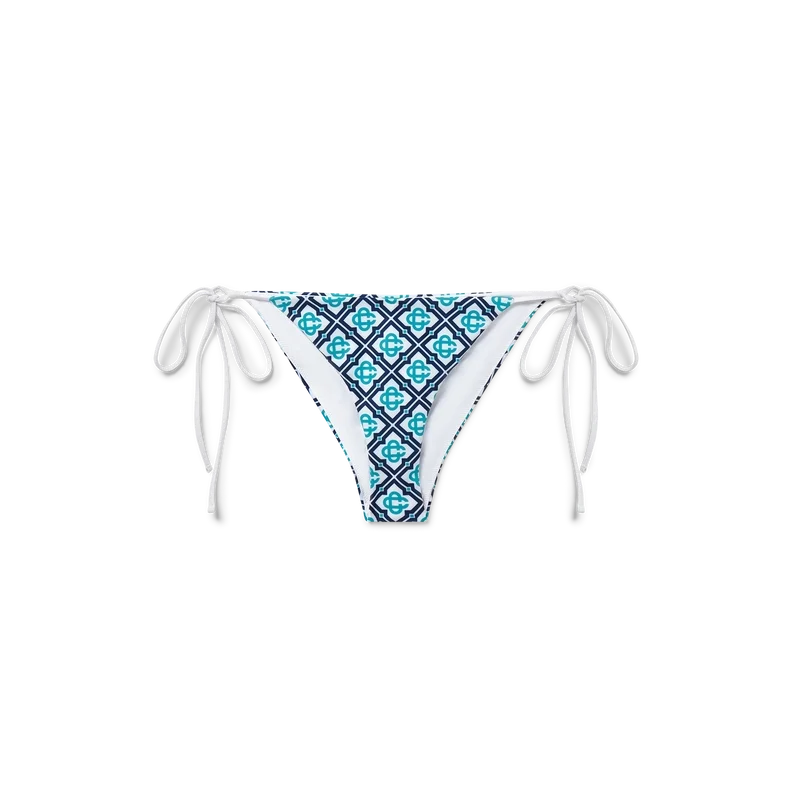 Der Monogram-Bikini-Slip ist ein bedrucktes Modell aus atmungsaktivem Funktionsstoff mit einem Farbverlaufs-Monogramm, das eine neue Interpretation des charakteristischen Casablanca-Prints darstellt. Abgerundet durch weiße Paspeln und einen Schnürverschluss – dieses Modell ist mit dem charakteristischen ineinander verschlungenen CC-Nieten-Logo des Hauses versehen – zum Tragen mit dem passenden Oberteil gedacht.