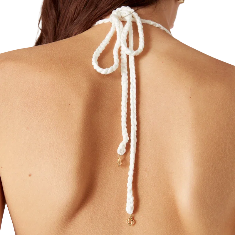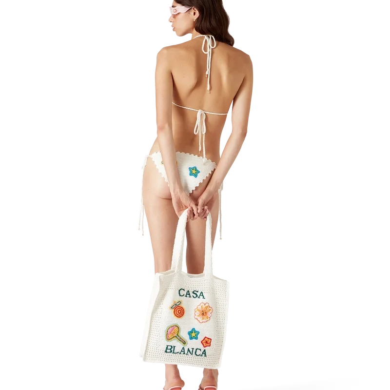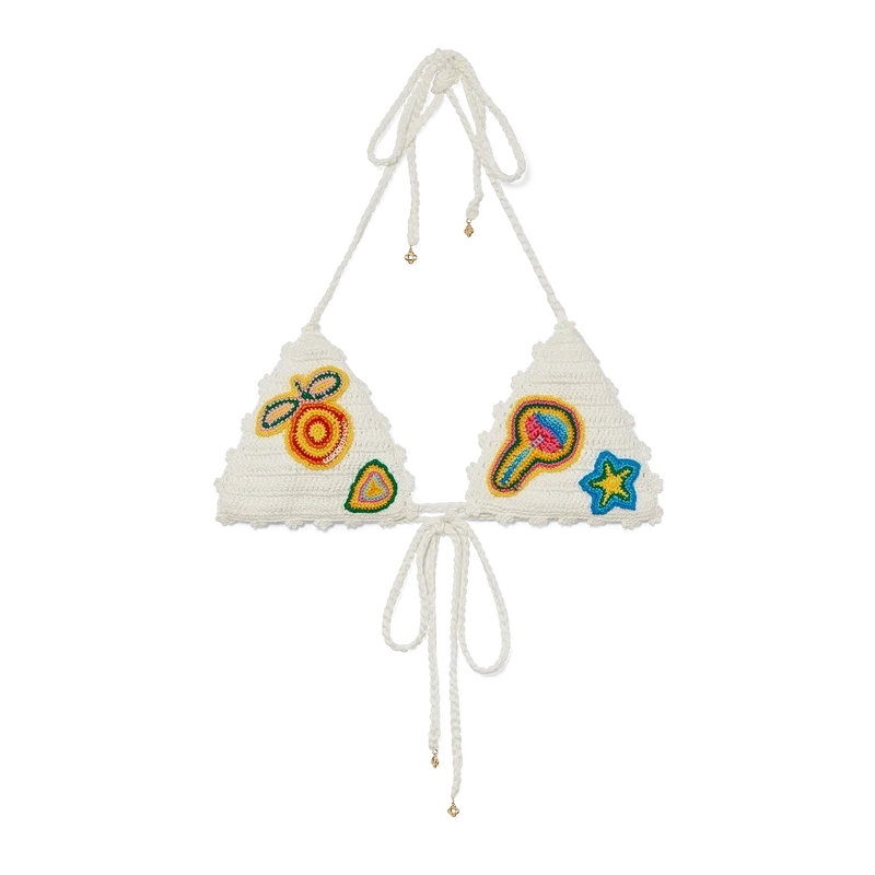 Das Motif Crochet Bikini-Oberteil ist ein dreieckiges Modell aus Häkelstoff. Es ist mit Motiven der klassischen Designelemente des Hauses verziert und verfügt über Bindebänder am Nacken und am Rücken. Dieses Modell ist mit herausnehmbaren Polstern ausgestattet und sollte mit dem passenden Bikini-Unterteil getragen werden.