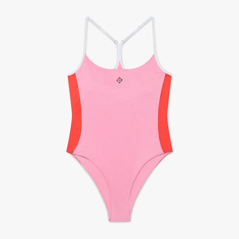 Der rosa Monogramm-Badeanzug ist ein raffiniertes Einteiler-Design mit dem charakteristischen Monogramm-Muster des Hauses in einer lebhaften Farbgebung aus Rosa, Rot und Weiß. Abgerundet durch einen U-Ausschnitt, weiße verstellbare Träger, rote Seiteneinsätze, hoch geschnittene Beine und das charakteristische Diamant-Logo des Hauses auf der Brust.
