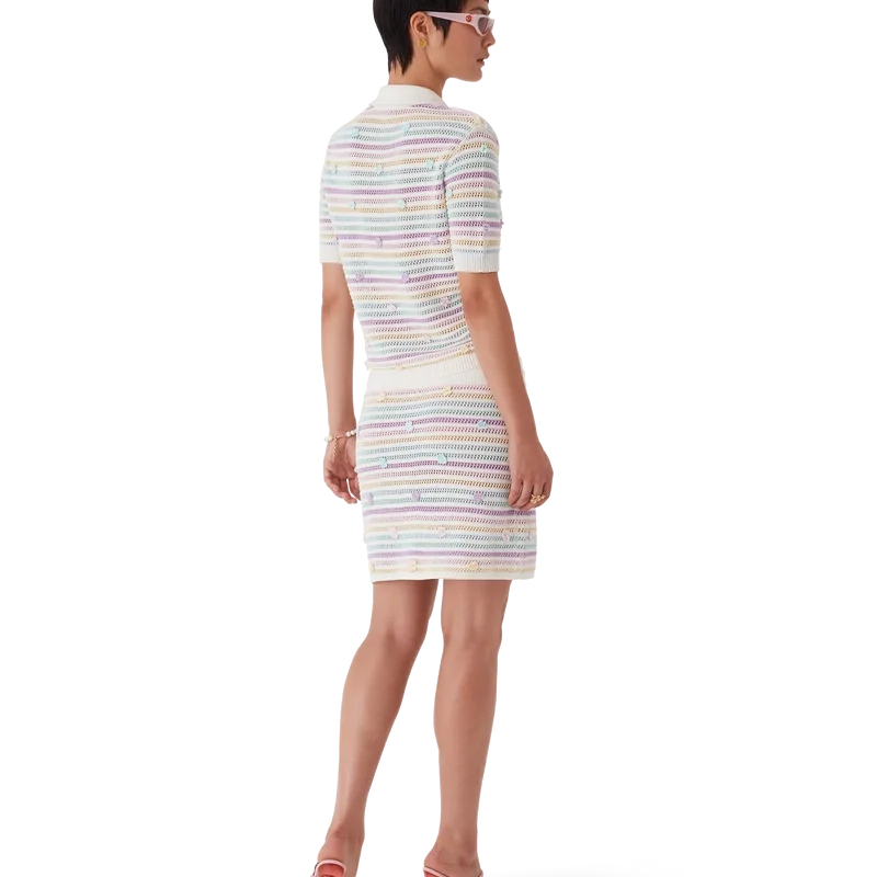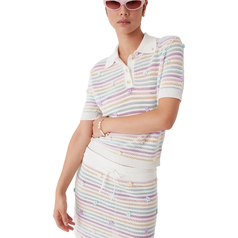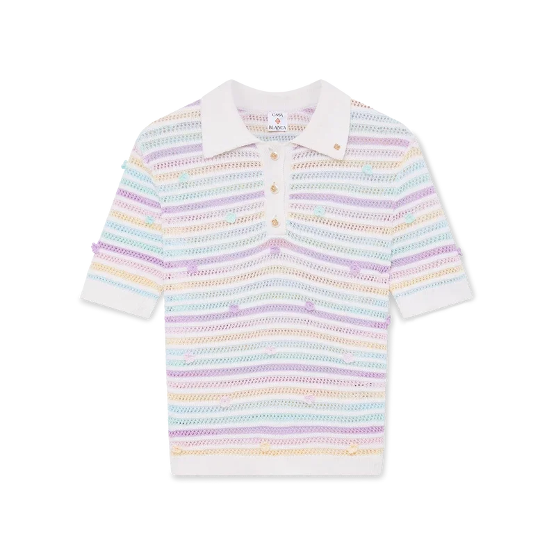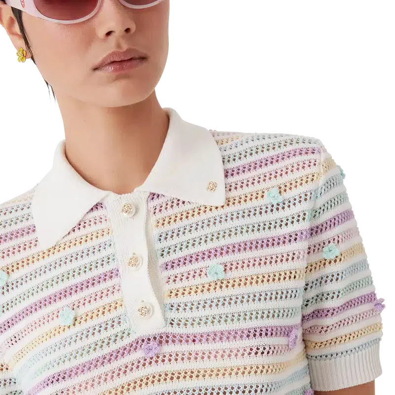 Das Baumwoll-Häkel-Poloshirt mit Blumenstreifen ist ein klassisches Kurzarm-Design aus einem offen gewebten Baumwollstoff. Abgerundet durch charakteristische goldgeränderte Perlknöpfe, Blumenmotive sowie Details an Kragen, Ärmelbündchen, Knopfleiste und Saum.