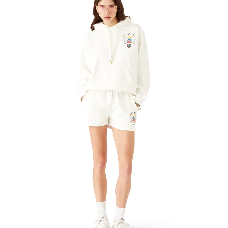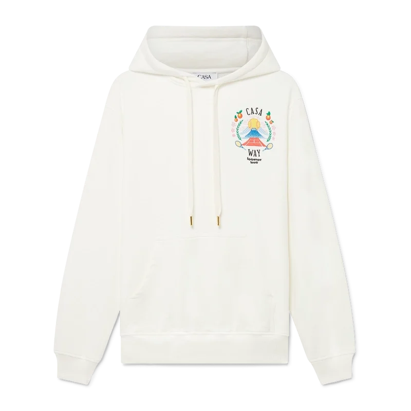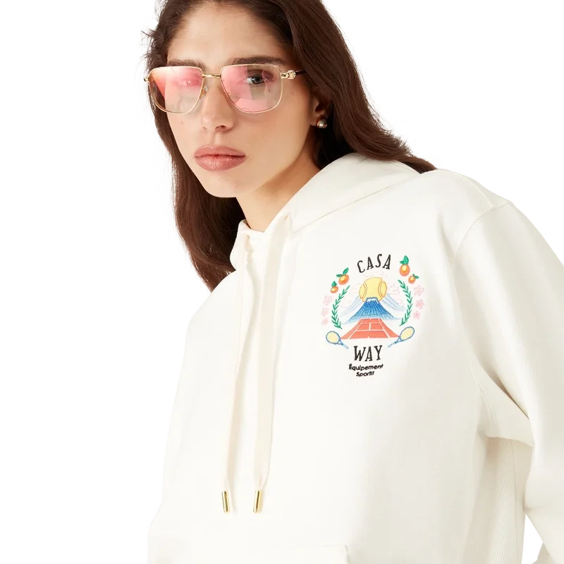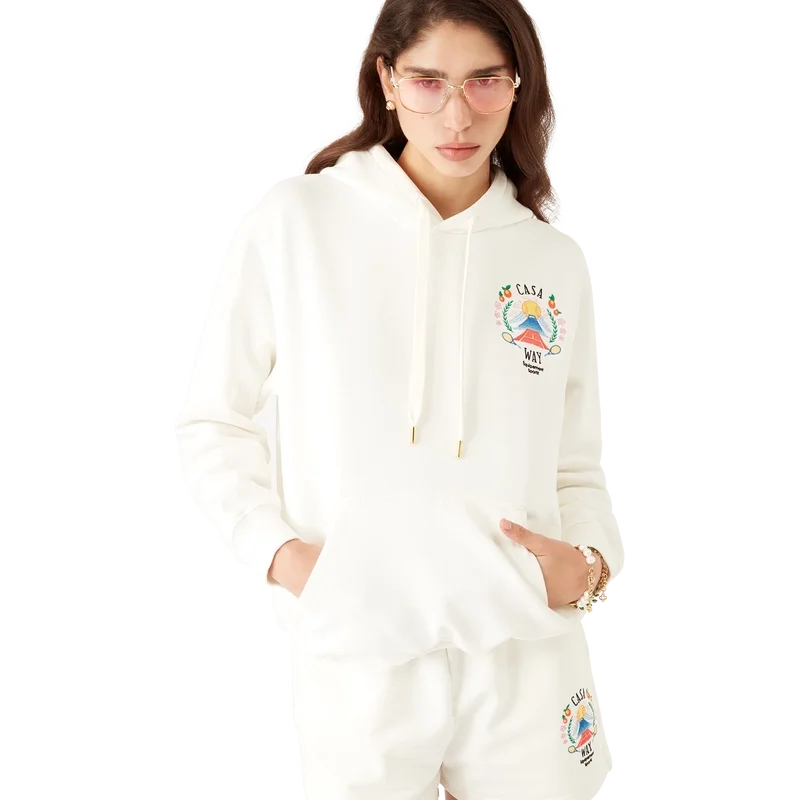 Das Casa Way Mountain Kapuzensweatshirt ist ein langärmeliges Modell aus Bio-Baumwollstoff und zeigt das für diese Saison neu interpretierte saisonale Design des Hauses.