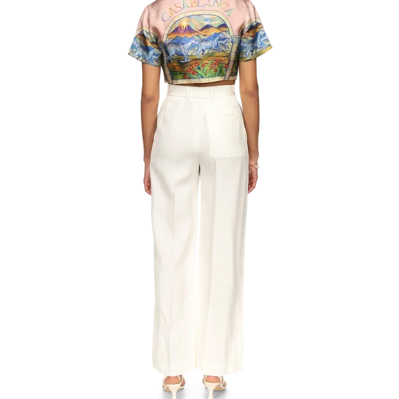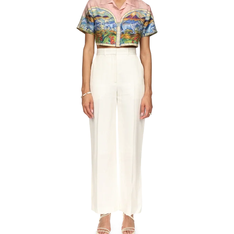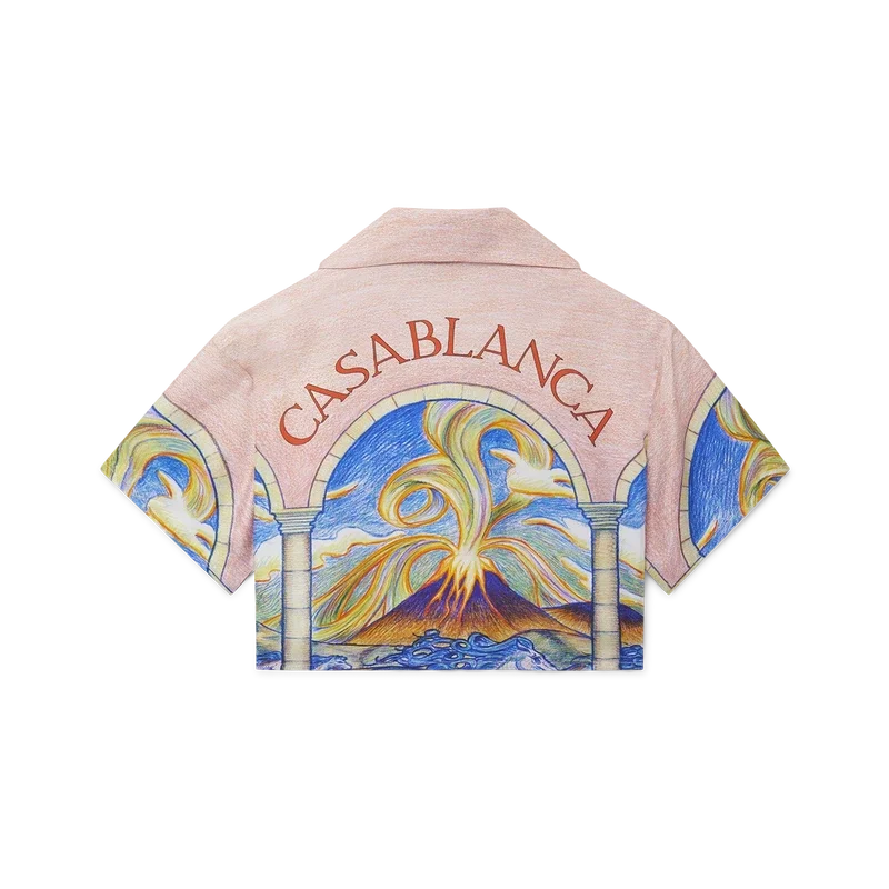 Das kurze Seidenhemd „Chevaux Sauvages“ ist mit einem saisonalen Druck aus der Futuro Optimisto-Kollektion versehen. Es verfügt über einen gespreizten Kragen und einen Knopfverschluss und ist dafür gedacht, offen getragen zu werden.