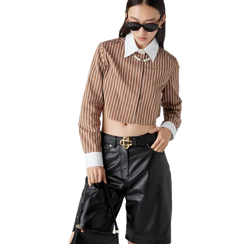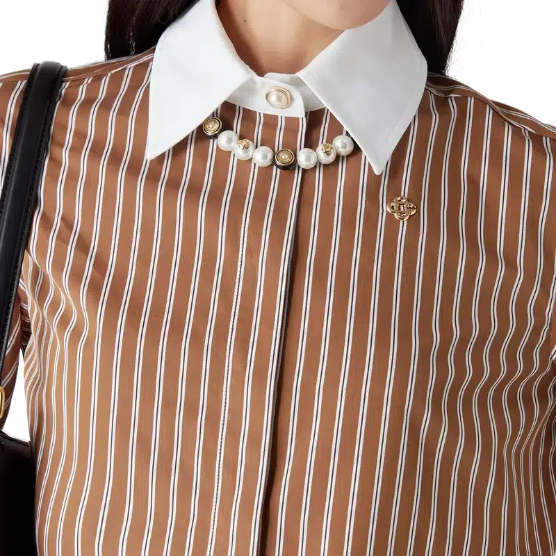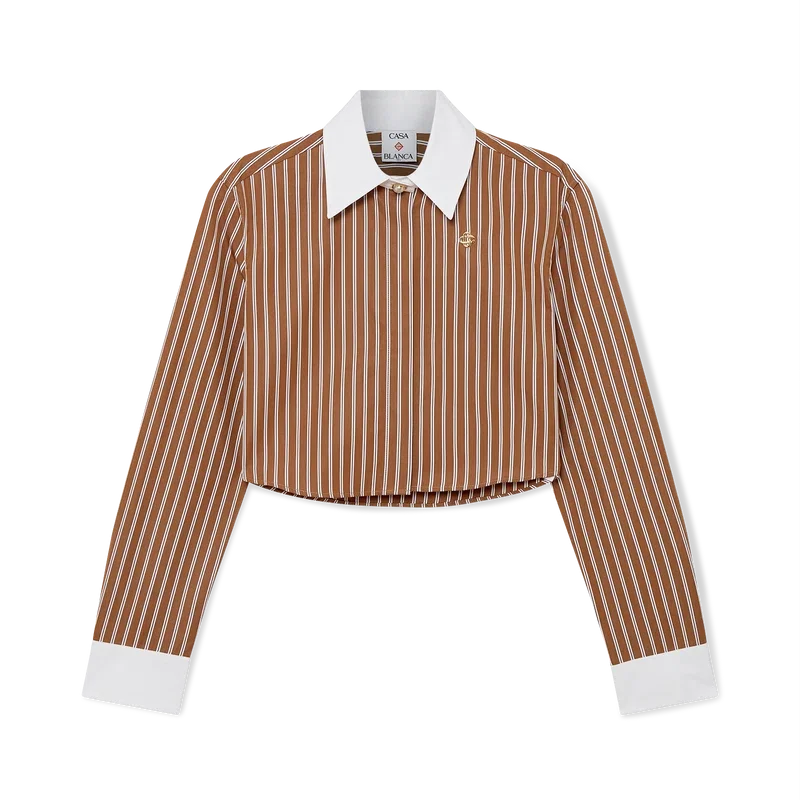 Das gestreifte, verkürzte Langarm-Hemd ist ein kurz geschnittenes Modell aus einem Baumwoll-Barra-Stoff. Mit Knopfleiste, ineinander verschlungenen Cc-Logo-Corozo-Knöpfen, charakteristischem goldrandigem Perlenknopf am Kragen, kontrastierendem weißem Spitzkragen und Manschetten sowie einem abgerundeten Saum.