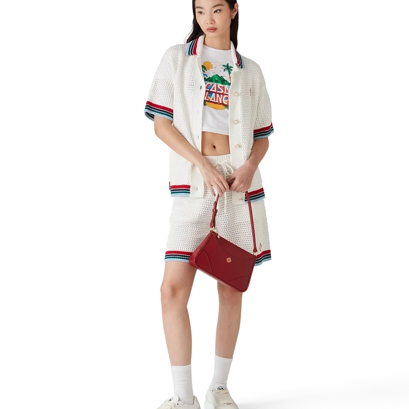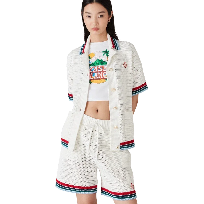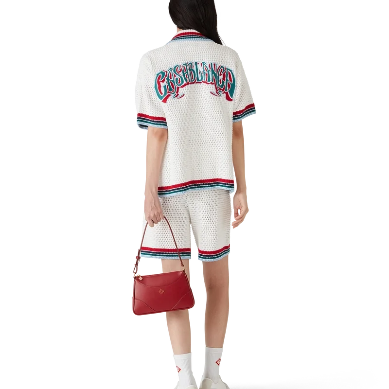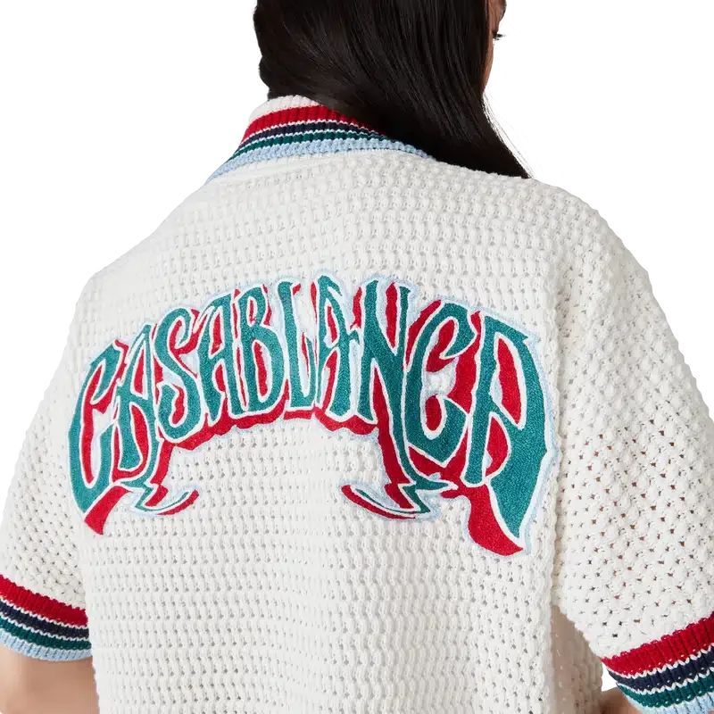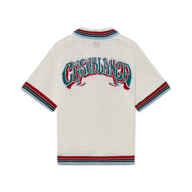 Das Gothic-Häkelhemd ist ein kurzärmeliges Strickmodell aus gehäkelter Baumwolle und ziert das charakteristische Rautenlogo des Hauses. Abgerundet wird es durch charakteristische goldene Perlenknöpfe, aufgesetzte Taschen auf der Vorderseite sowie gestreifte Kanten an Kragen, Manschetten und Saum.