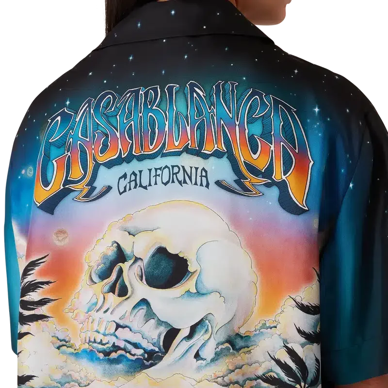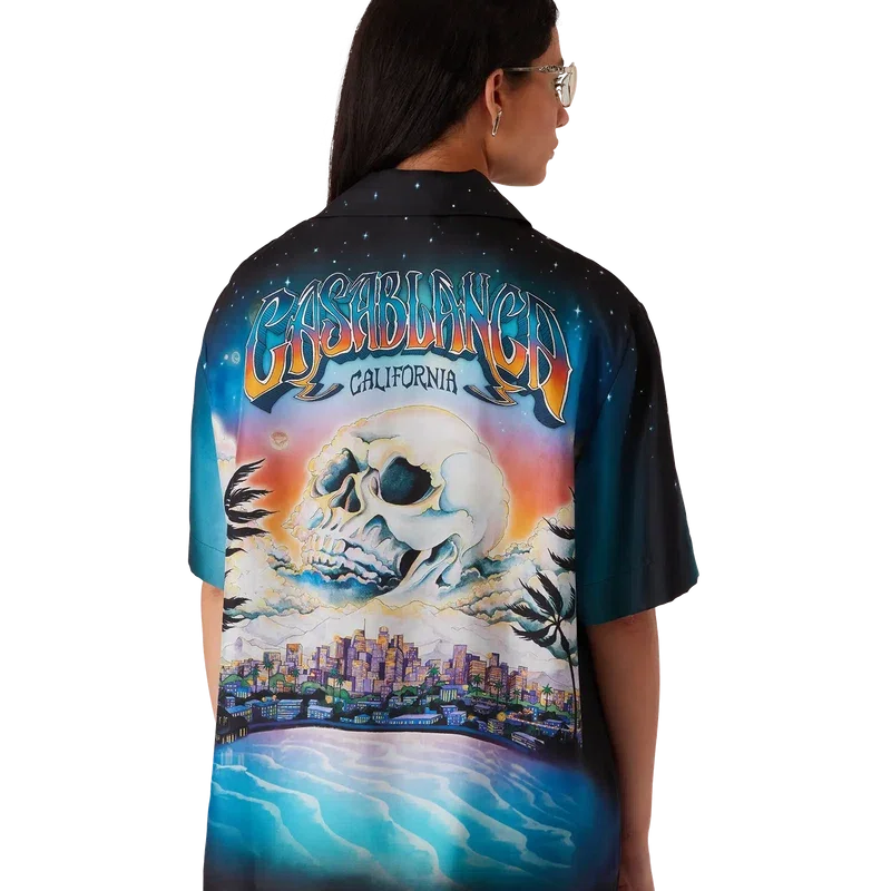 Das La Pramonition Seidenhemd ist ein kurzärmeliges Modell mit Druck, dessen Design von einer unheimlichen Vision der Skyline von La bei Nacht inspiriert ist und UFO-Elemente aufgreift, die an Vintage-Science-Fiction-Inspirationen anknüpfen. Abgerundet wird es durch einen kubanischen Kragen, eine Brusttasche, einen verdeckten Knopfverschluss und ineinander verschlungene CC-Corozo-Knöpfe.