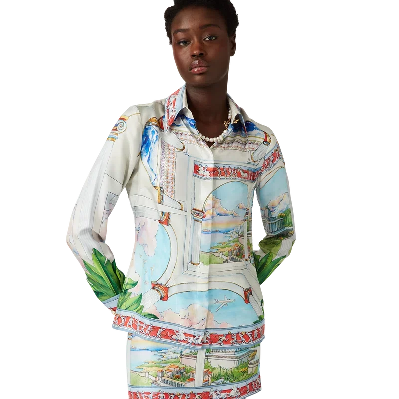 Das Seidenhemd „Le Passage“ ist ein langärmeliges Modell aus Seidentwill, das mit dem saisonalen Kunstwerk des Hauses verziert ist – es präsentiert vier verschiedene Dimensionen, die mit Perspektiven und Architektur spielen. Mit Kragen, Knopfleiste, Corozo-Knöpfen mit „Interlocking Cc“-Logo, charakteristischen goldumrandeten Perlenknöpfen am Kragen und an den Manschetten sowie von griechischen Mustern inspirierten Kantenverzierungen an Kragen, Manschetten und Saum.