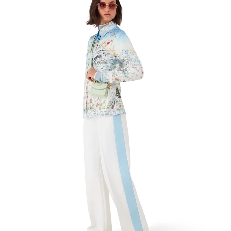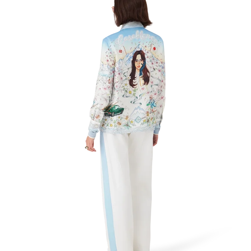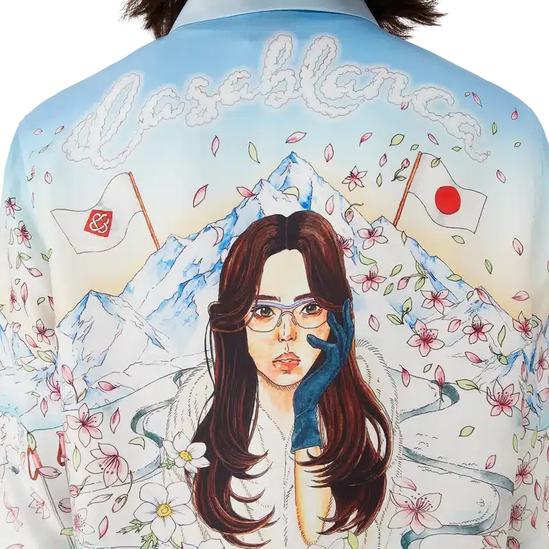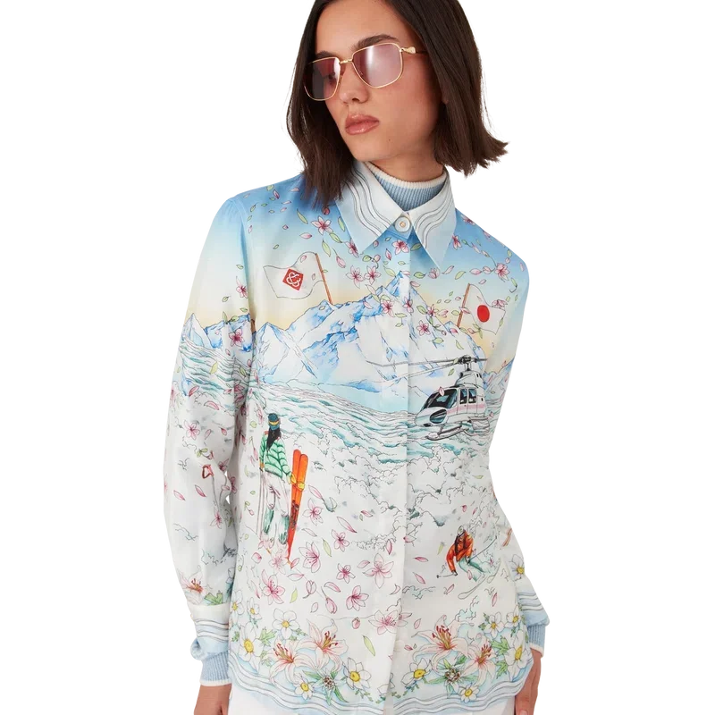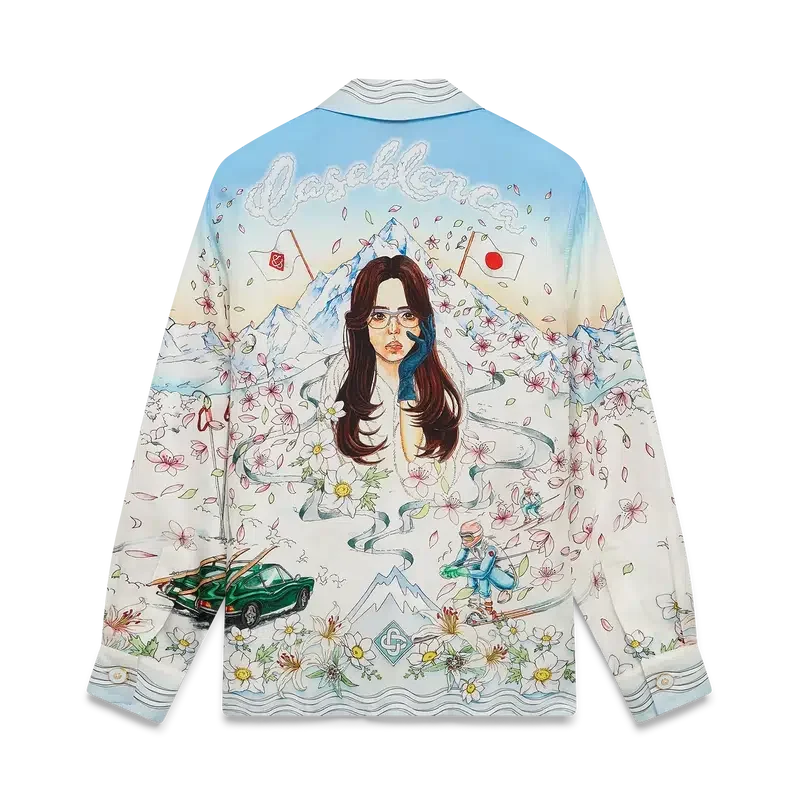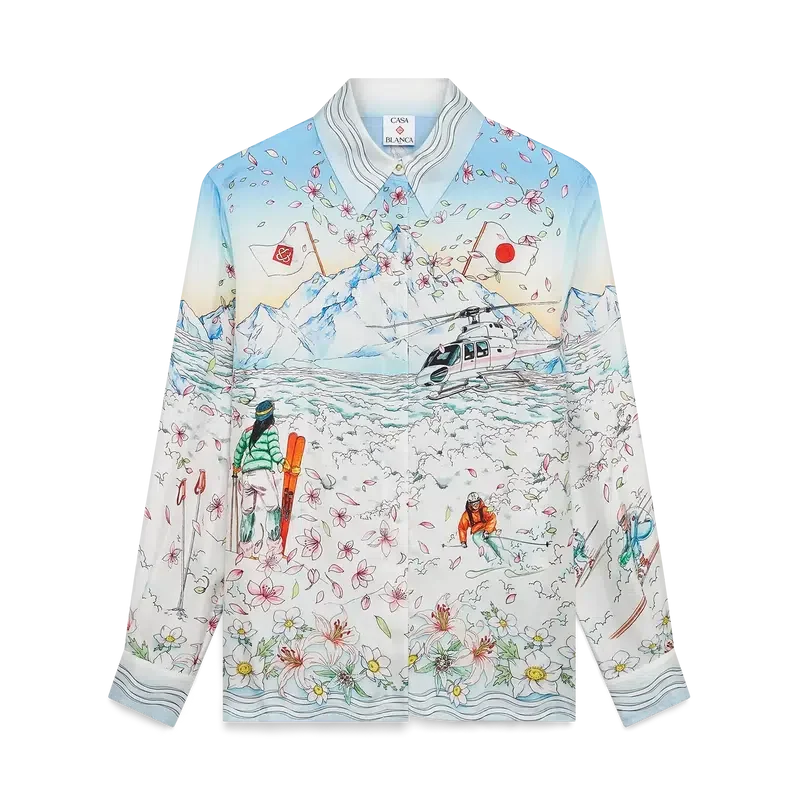 Das L’hiver Fleuri Langarmhemd aus Seidentwill ist ein charakteristisches Hemddesign mit dem saisonalen L’hiver Fleuri-Print, der von der natürlichen Schönheit Hokkaidos inspiriert ist. Dieses Modell zeigt einen rosafarbenen Sonnenaufgang vor markanten Bergformationen und ist eine Hommage an Japans Winterreiseziele mit einer idealisierten Darstellung verschneiter Landschaften, ergänzt durch Kirschblütenblätter, Skispuren und Winterausrüstung. Abgerundet wird das Design durch einen Kubanerkragen, einen Knopfverschluss, Corozo-Knöpfe mit ineinander verschlungenem Cc-Logo sowie goldrandige Emaille-Knöpfe an den Manschetten und eine Brusttasche.