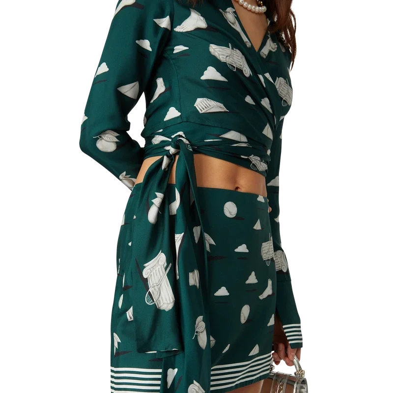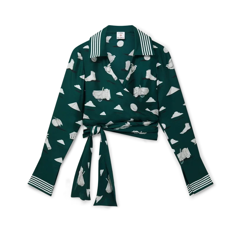 Das Metaphysical Seiden-Wickelhemd ist ein langärmeliges Modell mit durchgehendem Druck, gefertigt aus Seidentwill, mit sich wiederholendem Trompe-l’œil-Motiv im Steineffekt und dezenten Linien als zentrale Designelemente. Abgerundet durch einen Spitzkragen, ausgestellte Ärmel mit Schlitz und gestreiften Kanten sowie einen Wickelverschluss.