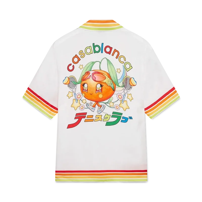 Das kurzärmelige Seidentwill-Hemd „Kawaii Orange Mascot“ ist ein bedrucktes Design mit saisonalen Motiven der „Kawaii Orange“ – diese als Orange gestaltete Figur ist eine Schlüsselfigur in unserem Universum und trägt Casa-Accessoires, eine Brille und Sneakers. Sie ist vor allem in den Damenmodellen der Kollektion zu sehen. Abgerundet durch einen Kubanerkragen, Knopfverschluss, Corozo-Knöpfe mit ineinander verschlungenem Cc-Logo, eine Brusttasche sowie rote, orangefarbene, gelbe und grüne Streifen als Kantenverzierung an Kragen, Manschetten, Saum und Tasche.