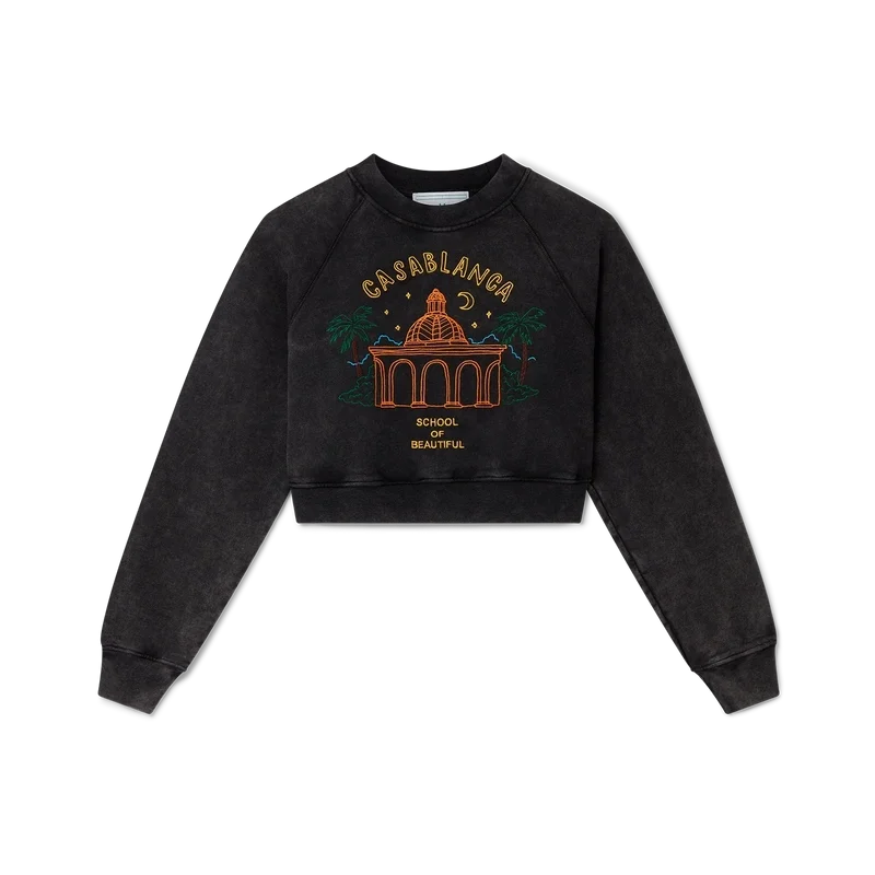 Das School of Beautiful Cropped Sweatshirt ist ein Sweatshirt aus verblasstem schwarzem Jersey mit einer Stickerei auf der Brust. Das Sweatshirt besteht aus 100 % schwarzer Bio-Baumwolle und ist ein klassisches Modell mit Rundhalsausschnitt, langen Ärmeln und einem verkürzten Schnitt, der über dem Bauchnabel endet.