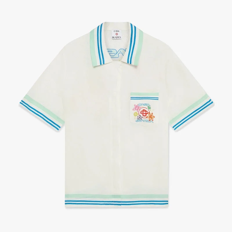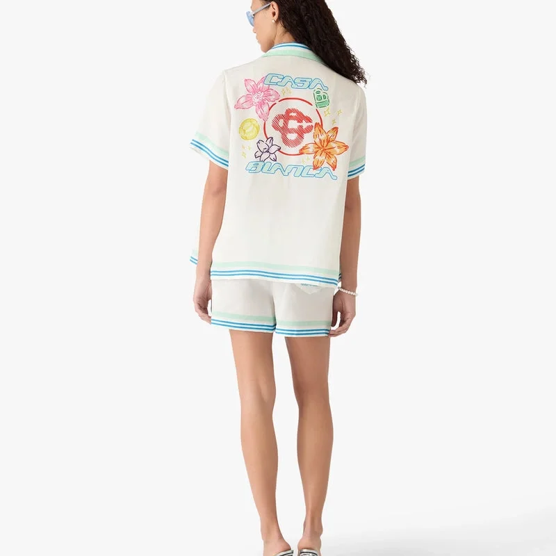 Das kurzärmelige Seidenhemd mit kubanischem Kragen und Blumenmuster ist ein bedrucktes Design, das die grafische Collage der Saison mit Interpretationen des Logos, eines Smileys und einer Orchideenblüte zeigt. Es verfügt über einen Kubanischen Kragen, einen Knopfverschluss, Corozo-Knöpfe mit dem ineinander verschlungenen Cc-Logo, eine Brusttasche sowie grün-blau-weiße Streifen an Kragen, Manschetten, Saum und Tasche und besticht durch eine lockere Silhouette.