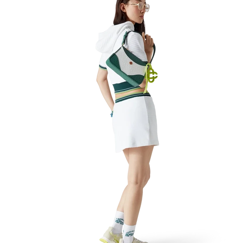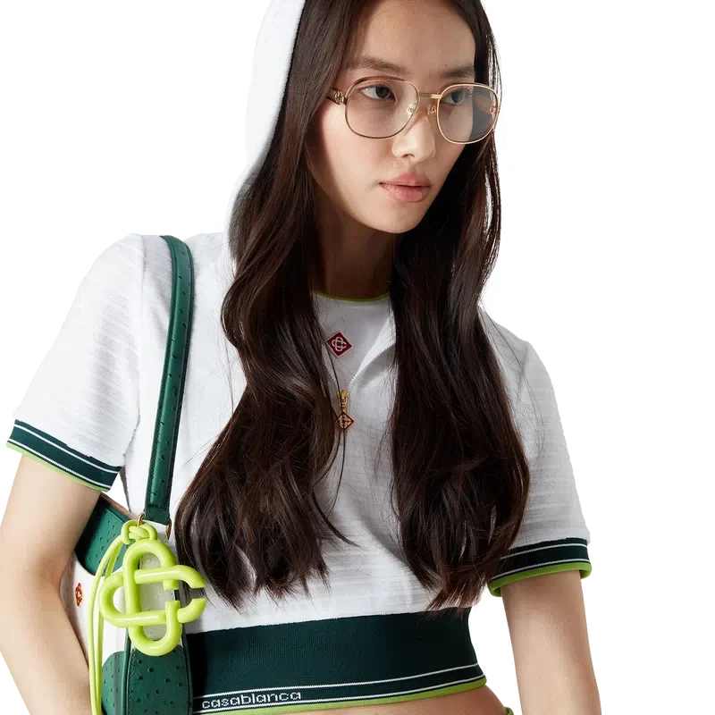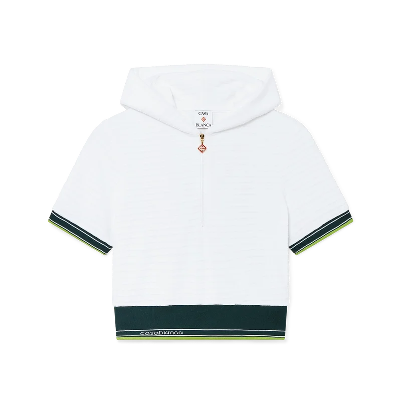 Das strukturierte, verkürzte Tennis-Kapuzenshirt aus Velours ist ein kurzärmeliges Modell aus Veloursstoff. Es verfügt über eine Kapuze, einen Viertelreißverschluss mit dem charakteristischen Rautenlogo des Hauses sowie kontrastierende gerippte Bündchen und einen Saum mit gestreiften Kanten.