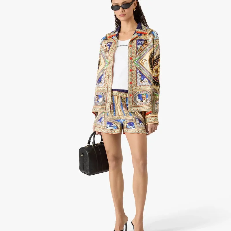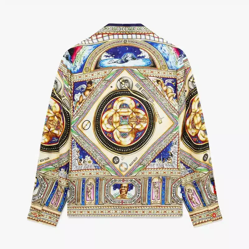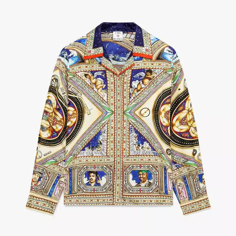Das Take Me to Church Seidenhemd mit kubanischem Kragen und langen Ärmeln ist ein Allover-Print-Design mit Motiven, die von den kunstvollen und detailreichen bemalten Decken der Renaissance inspiriert sind und zeitlose Themen wie Musik und Tanz darstellen. Abgerundet wird das Design durch einen Kubanischen Kragen, einen Knopfverschluss, charakteristische Corozo-Knöpfe mit dem ineinander verschlungenen Cc-Logo sowie goldrandige Emaille-Knöpfe an den Manschetten und eine lockere Silhouette.