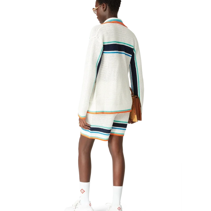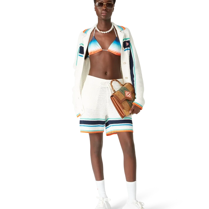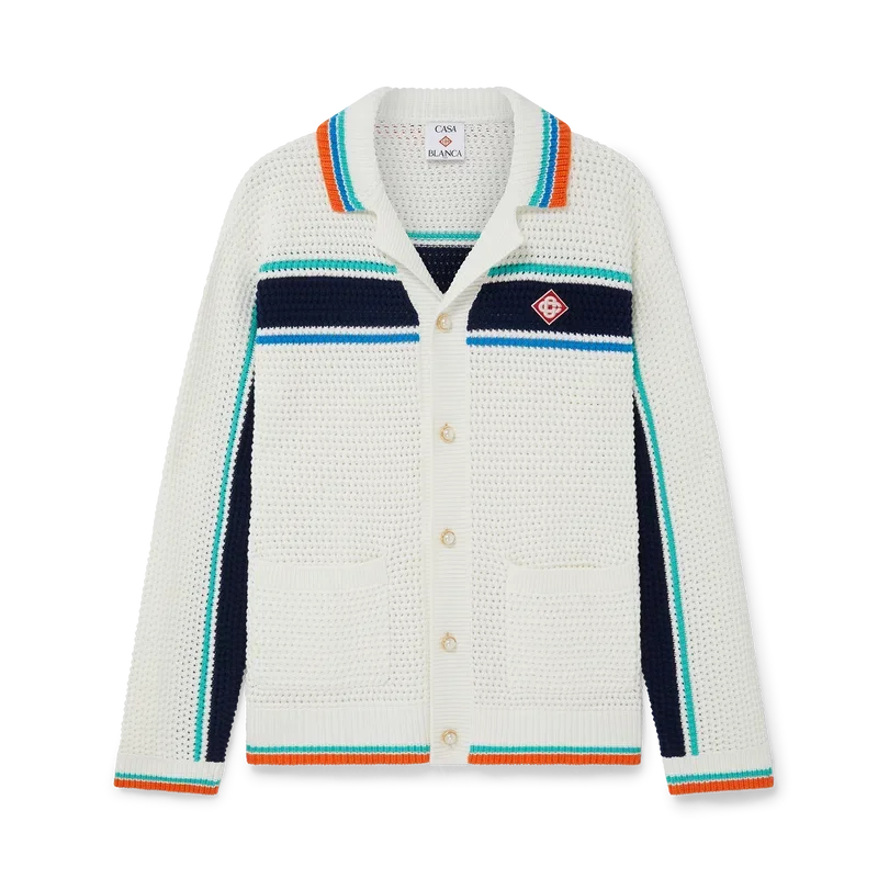 Das Tennis Crochet Shacket ist ein langärmeliges, strukturiertes Design aus einem gehäkelten Bio-Baumwollstoff und ziert das charakteristische Rautenlogo des Hauses, das an das Reise- und Urlaubsthema der Kapselkollektion anknüpft. Abgerundet wird das Design durch einen gerippten Kragen, Ärmelbündchen, Saum und Knopfleiste, aufgesetzte Brusttaschen, charakteristische goldgerahmte Perlenknöpfe, einen Knopfverschluss vorne sowie aqua-, blau- und weiß gestreifte Details auf Brust, Rücken und entlang der Ärmel, ergänzt durch kontrastierende Kanten an Ärmelbündchen, Saum und Kragen.