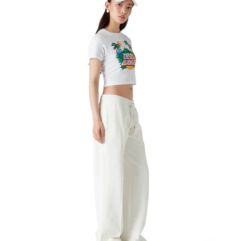 Die Casa Beach Wave Sweatpants ist ein bedrucktes Modell aus Bio-Baumwollstoff und verfügt über ein charakteristisches Design, das an ein Souvenir erinnert, das man im Strandurlaub kaufen würde. Abgerundet wird sie durch einen elastischen Bund, einen Kordelzug mit goldenen Enden, Nahttaschen und eine aufgesetzte Gesäßtasche.