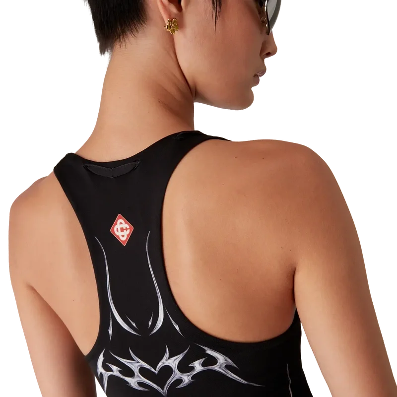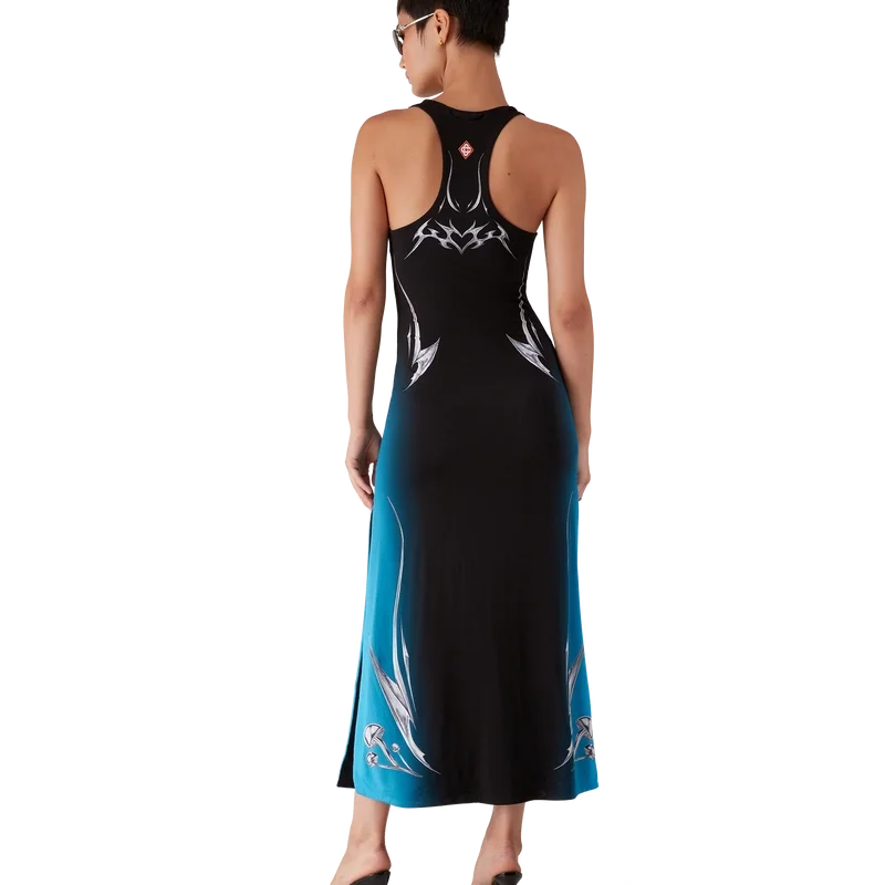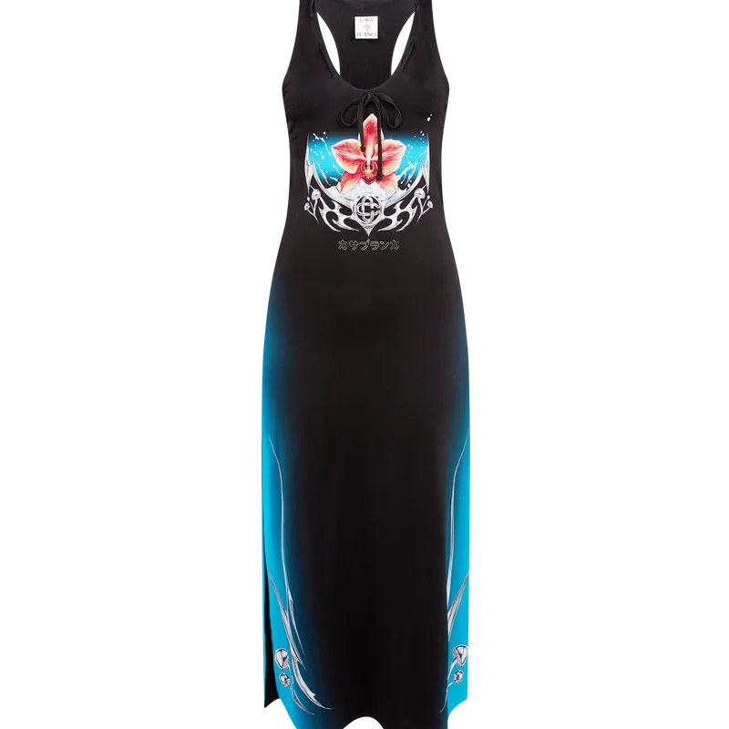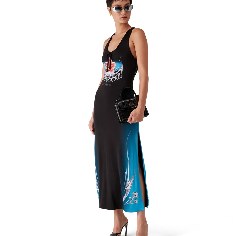 Das Blades Slinky Jersey-Kleid ist ein bedrucktes, ärmelloses Maxikleid mit dem Blades-Motiv dieser Saison, das mit dem Kontrast zwischen zwei gegensätzlichen Empfindungen spielt – der Schärfe der Klinge und dem kalten, silbernen Chrom, kontrastiert mit der Wärme der Natur, wie den kräftigen Rosa- und Rottönen einer Orchideenblüte. Die Wassertröpfchen verleihen dem Design eine frische, klare Note. Abgerundet wird das Kleid durch einen U-Ausschnitt und einen Racerback.