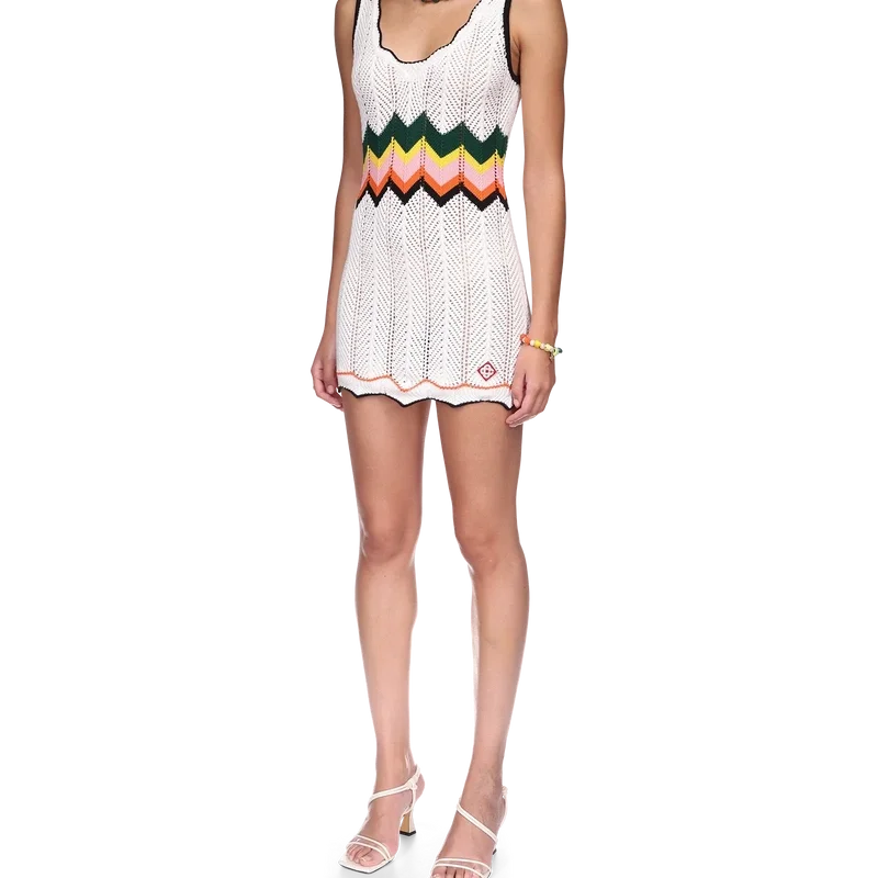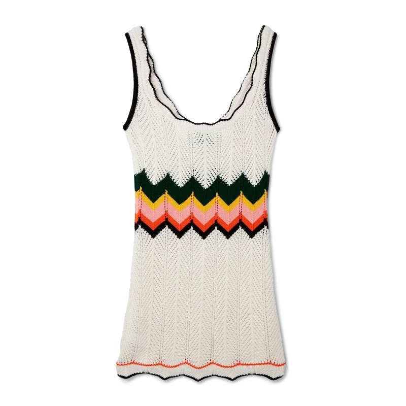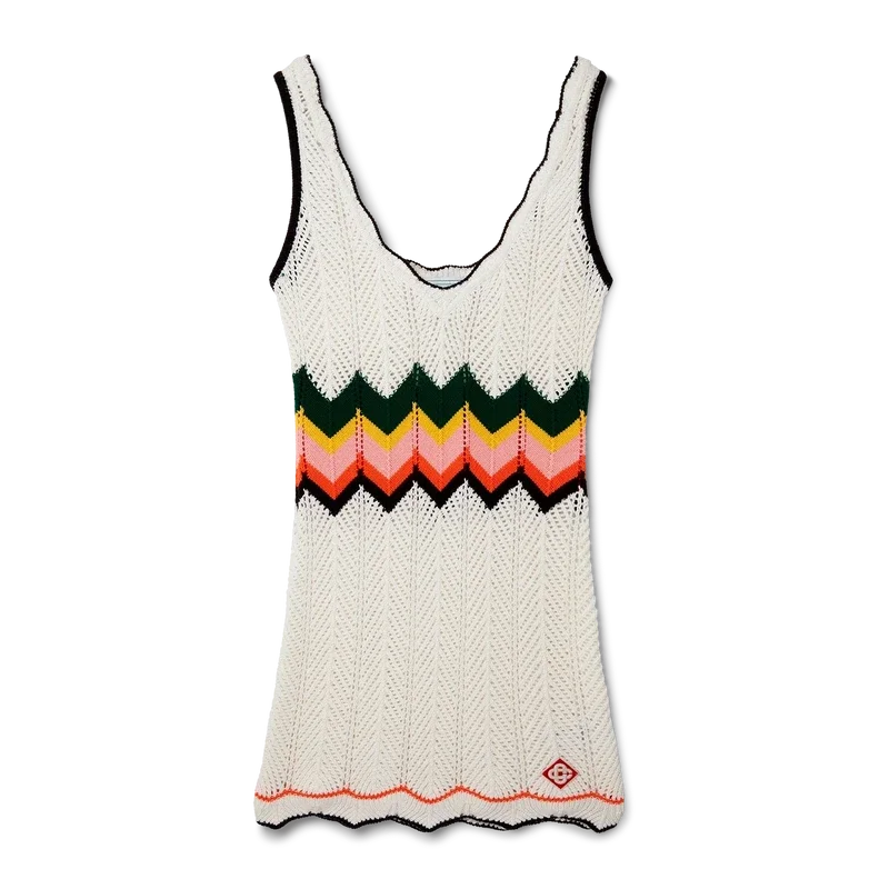 Das Chevron-Spitzenkleid ist ein ärmelloses Minikleid mit dem charakteristischen Wellenmotiv des Hauses, das in ein Zickzackmuster übergeht, wobei Chevrons die Farben der Saison und das Diamant-Logo-Patch hervorheben. Abgerundet wird es durch einen tiefen V-Ausschnitt und Spitzenverzierungen.