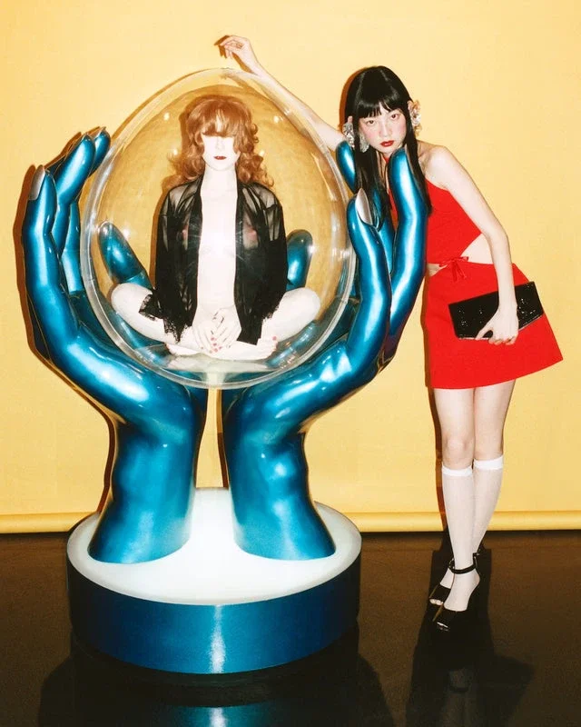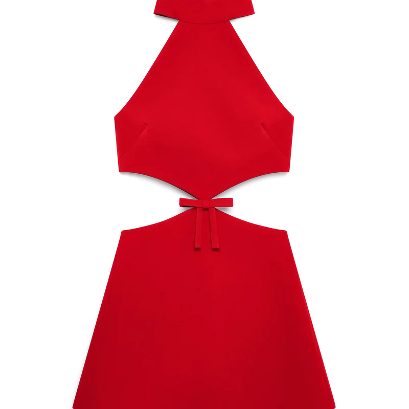 Das Cut-Out-Kleid ist ein ärmelloses A-Linien-Minikleid mit Cut-Out-Details an den Seiten. Es verfügt über einen Reißverschluss, einen Neckholder-Ausschnitt mit Stehkragen und eine Schleife an der Taille, wo der Stoff sich verjüngt.