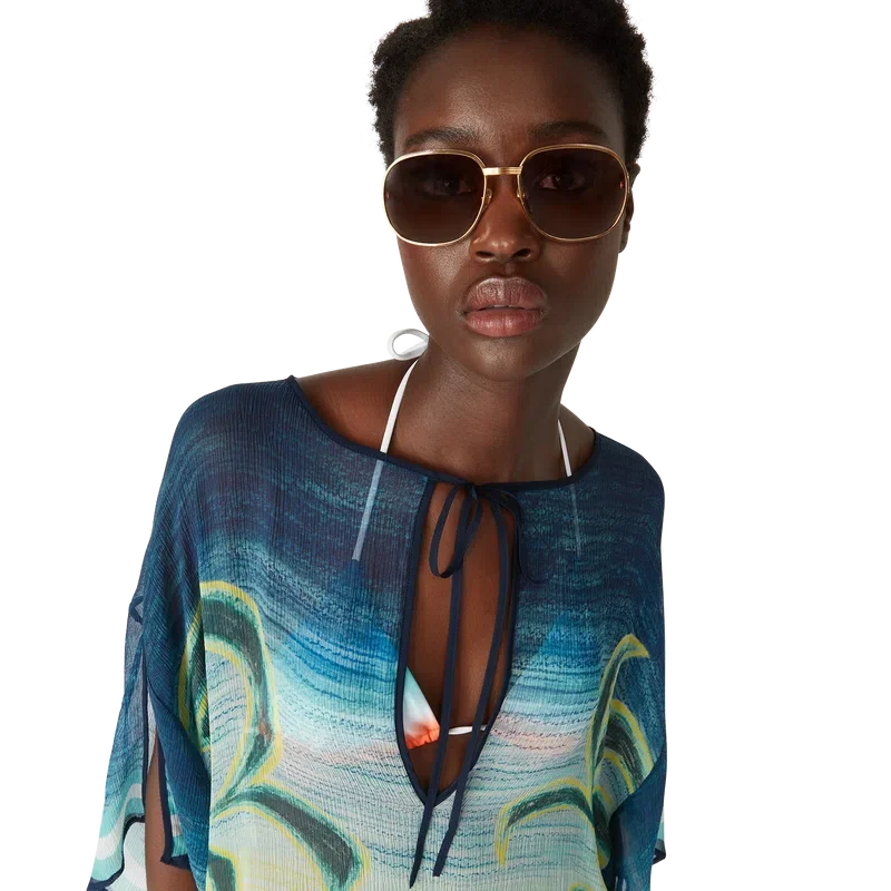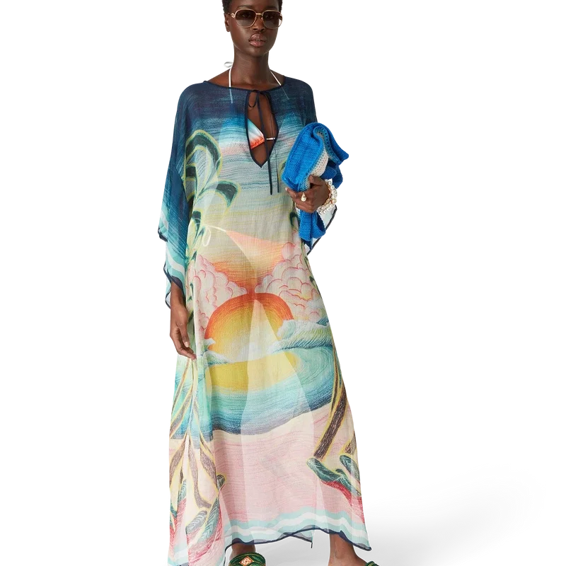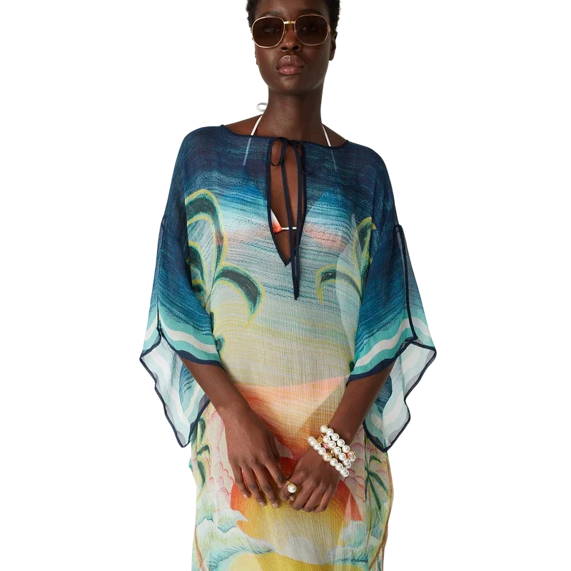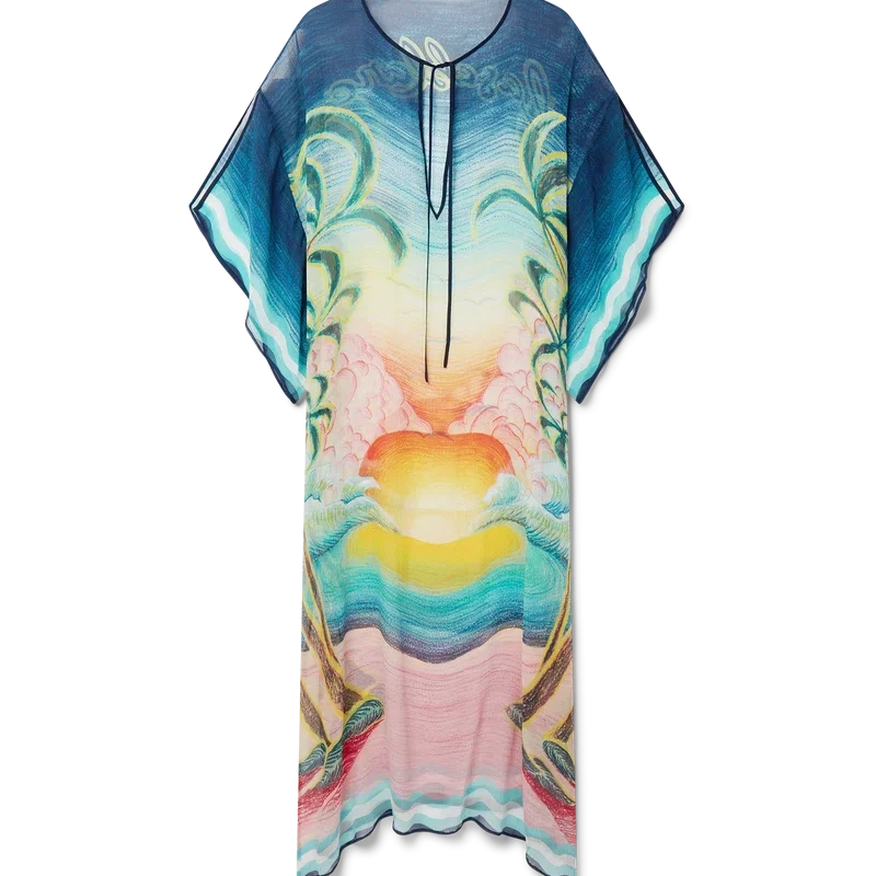 Der Danse De La Mer Kaftan ist ein locker sitzendes, leichtes Modell aus bedrucktem Seidenstoff mit handgemalten Motiven, die speziell für diese Kollektion entworfen wurden. Mit weiten Ärmeln, Seitenschlitzen und einem V-Ausschnitt mit Kordelzug.