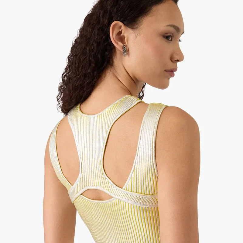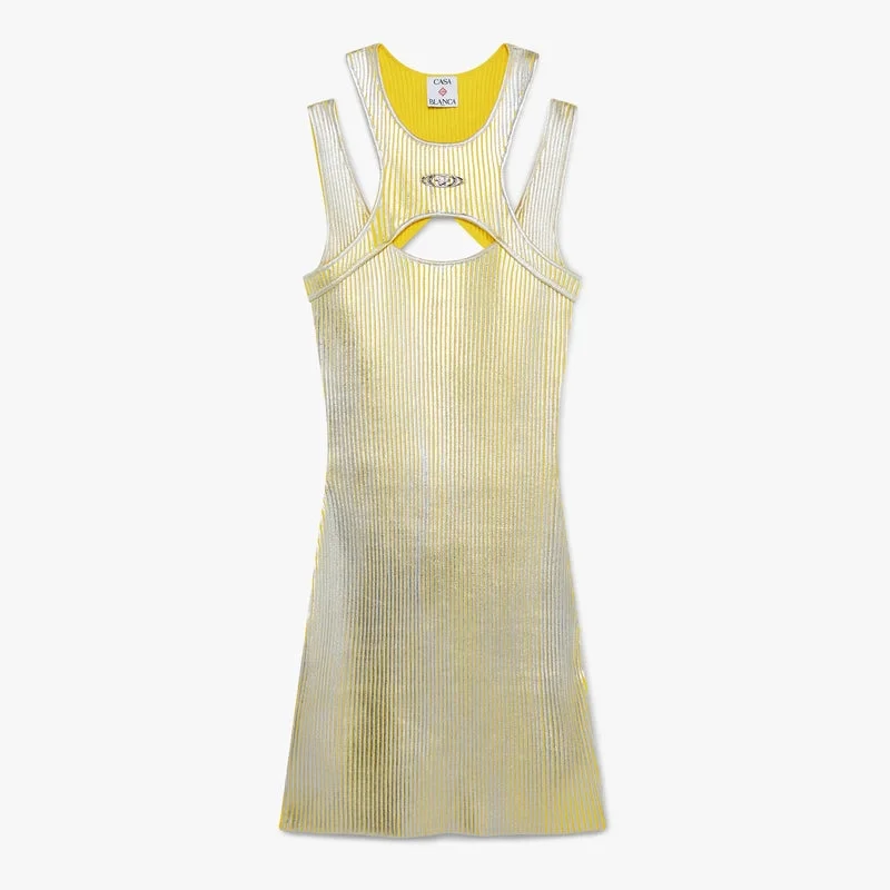 Das gelbe Minikleid mit Folienprint ist ein ärmelloses, raffiniertes Strickdesign mit dem versilberten Warped-Logo des Hauses. Abgerundet wird es durch einen Racerback und eine schmeichelhafte Minisilhouette, die die Designcodes des Hauses verkörpert.