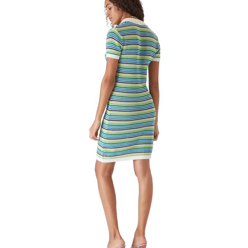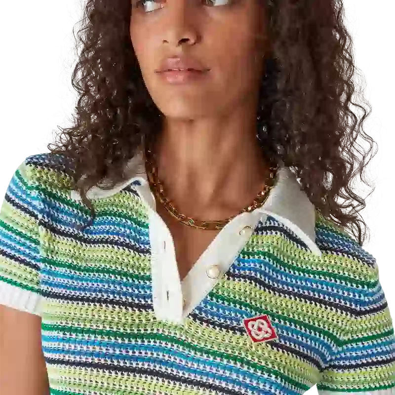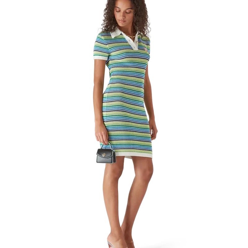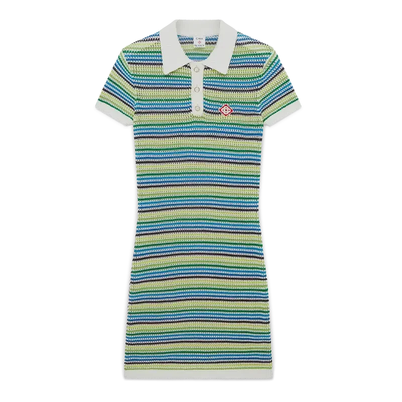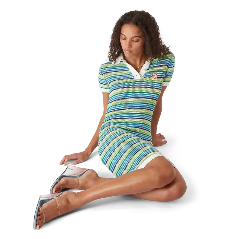 Das gestreifte Kleid ist ein Modell im Mini-Stil mit dem für das Haus typischen Kragen mit Diamant-Logo, kurzen Ärmeln und einer Midi-Silhouette. Abgerundet wird es durch das charakteristische Streifenmuster des Hauses, Details mit Diamant-Logo und eine raffinierte Strickverarbeitung, die raffinierte Eleganz ausstrahlt.