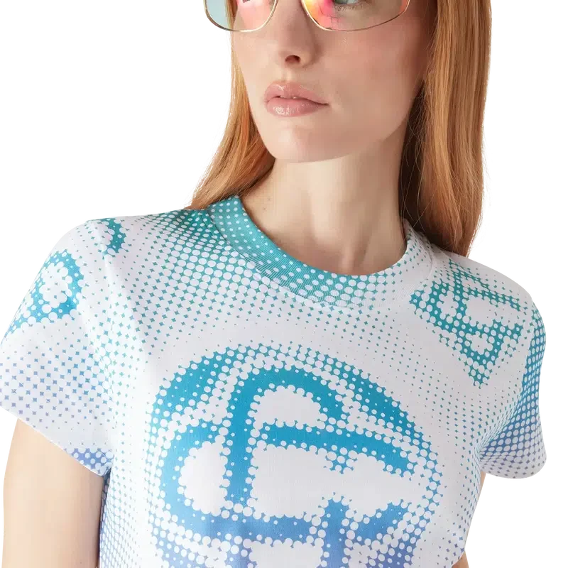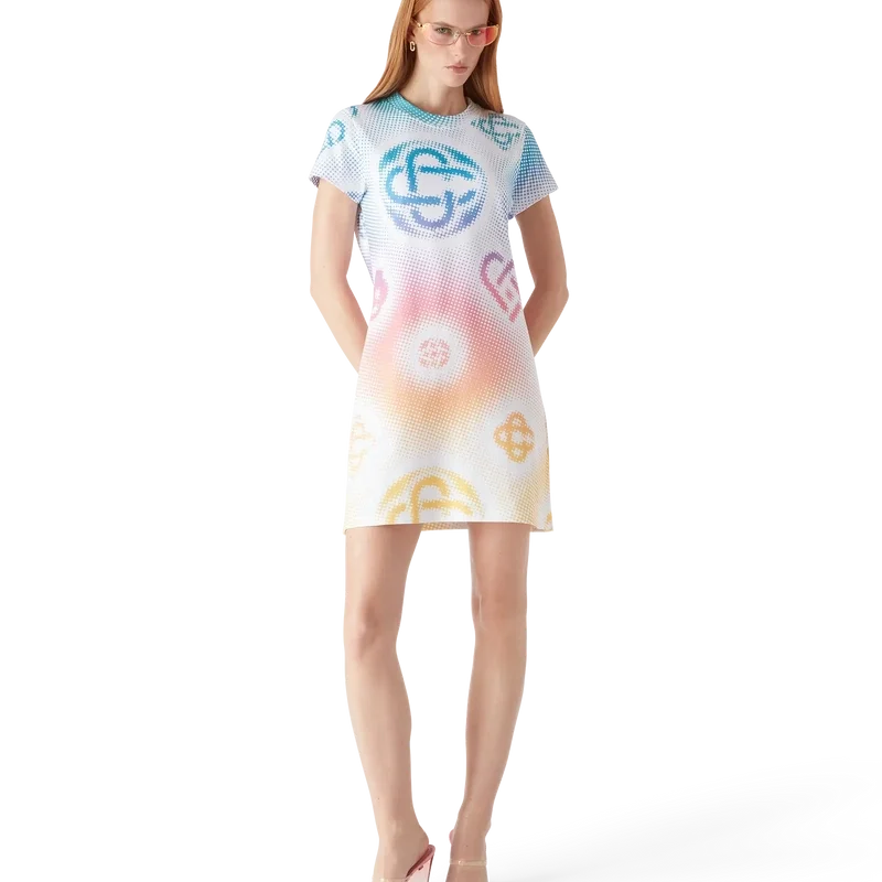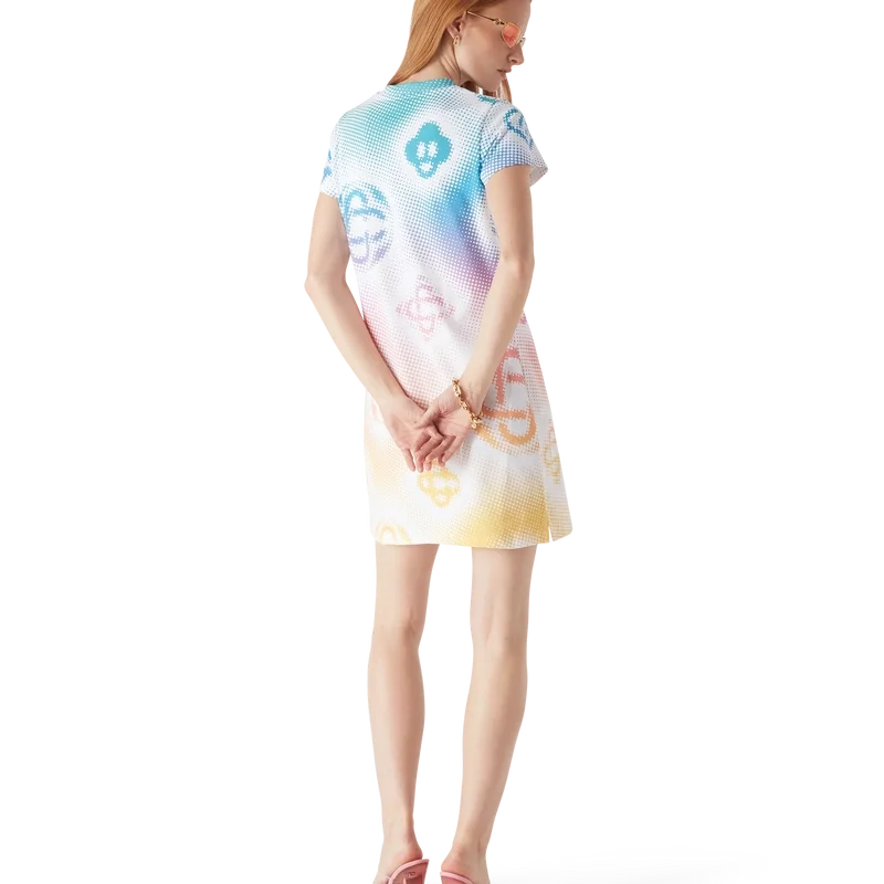 Das Halftone-T-Shirt-Kleid ist ein kurzärmeliges Modell aus bedrucktem Baumwollstoff mit einem Monogramm-Motiv des Hauses, das im Airbrush-Verfahren aufgebracht wurde und auf unseren früheren Experimenten mit dieser Technik aufbaut. Es verfügt über einen klassischen Rundhalsausschnitt und eine lockere Silhouette.