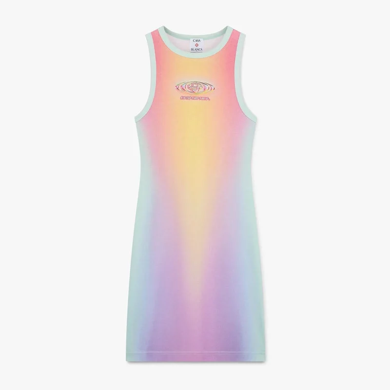 Das Glass Gradient Maxi-Tank-Kleid besticht durch ein raffiniertes Design mit dem saisonalen Glass-Gradient-Motiv, das in Zusammenarbeit mit Martin Naumann entstanden ist, der für seine Arbeiten mit Farbverläufen und Struktureffekten, Halbtonbildern und glasartigen Effekten bekannt ist. Abgerundet wird das Kleid durch einen Rundhalsausschnitt, eine ärmellose Silhouette, das Warped-Logo des Hauses und ein Casablanca-Logo mit glasartigem Effekt auf der Vorderseite.
