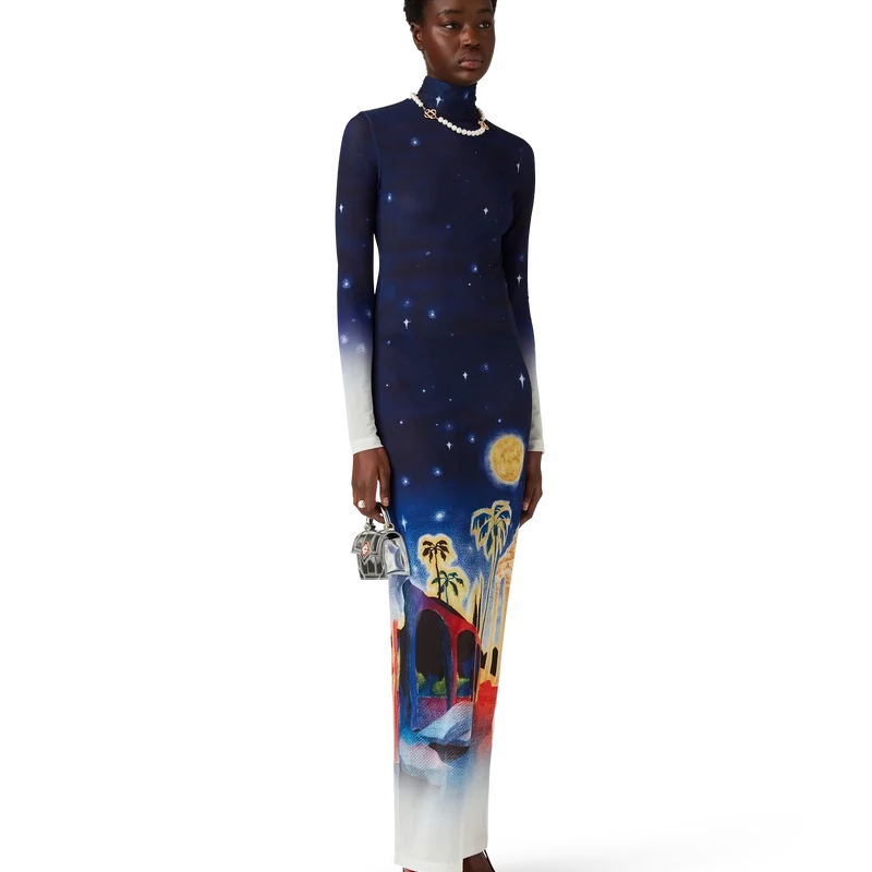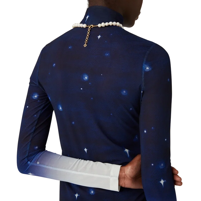 Das Midnight Acropolis Mesh-Kleid ist ein langärmeliges, durchgehend bedrucktes Design aus Stretch-Mesh-Stoff mit dem saisonalen Print des Hauses, das mit dem Licht des Tempels und des Himmels eine Hommage an die wunderschöne Nacht des antiken Griechenlands darstellt und durch ein klassisches Poloshirt abgerundet wird.
