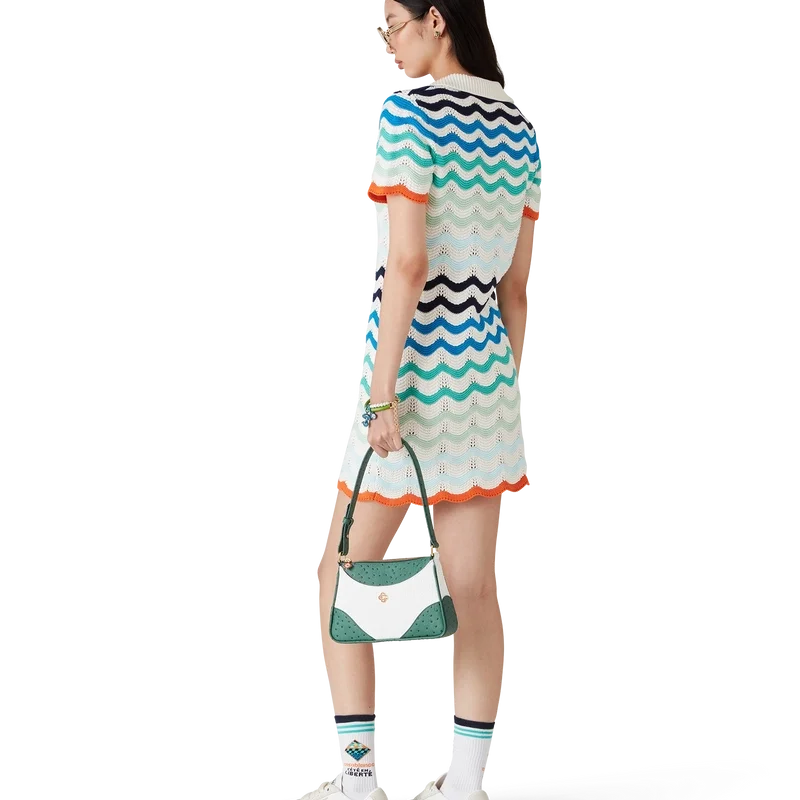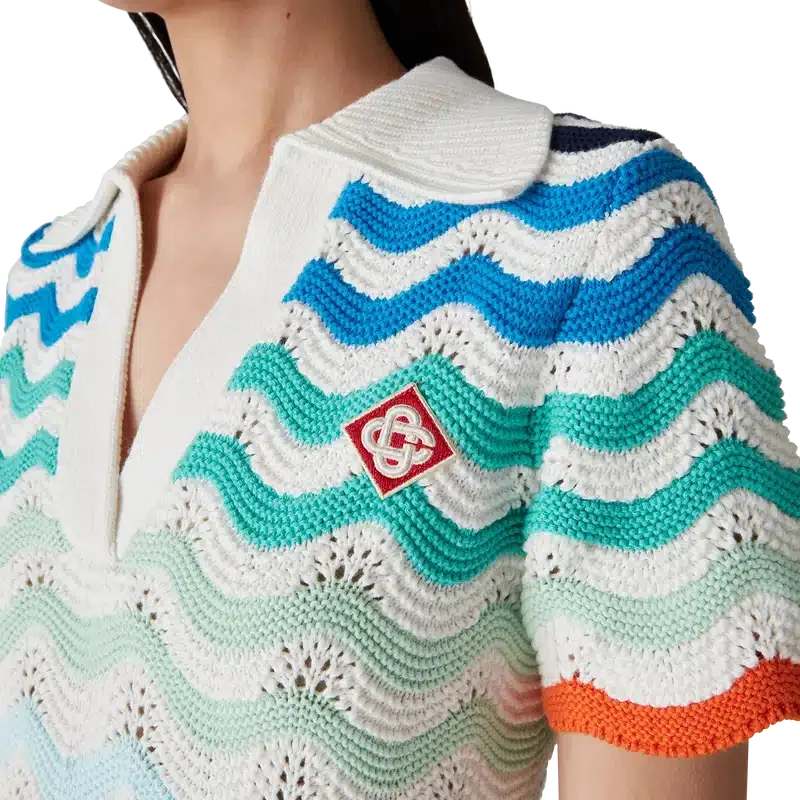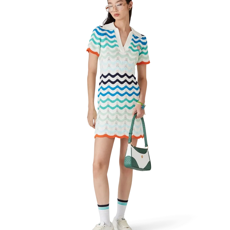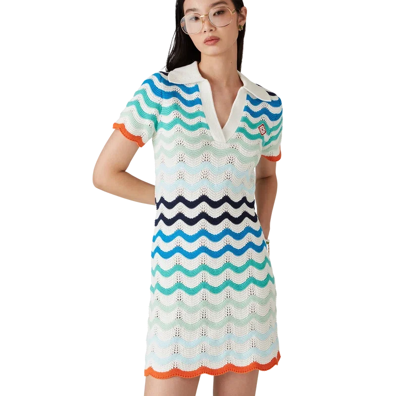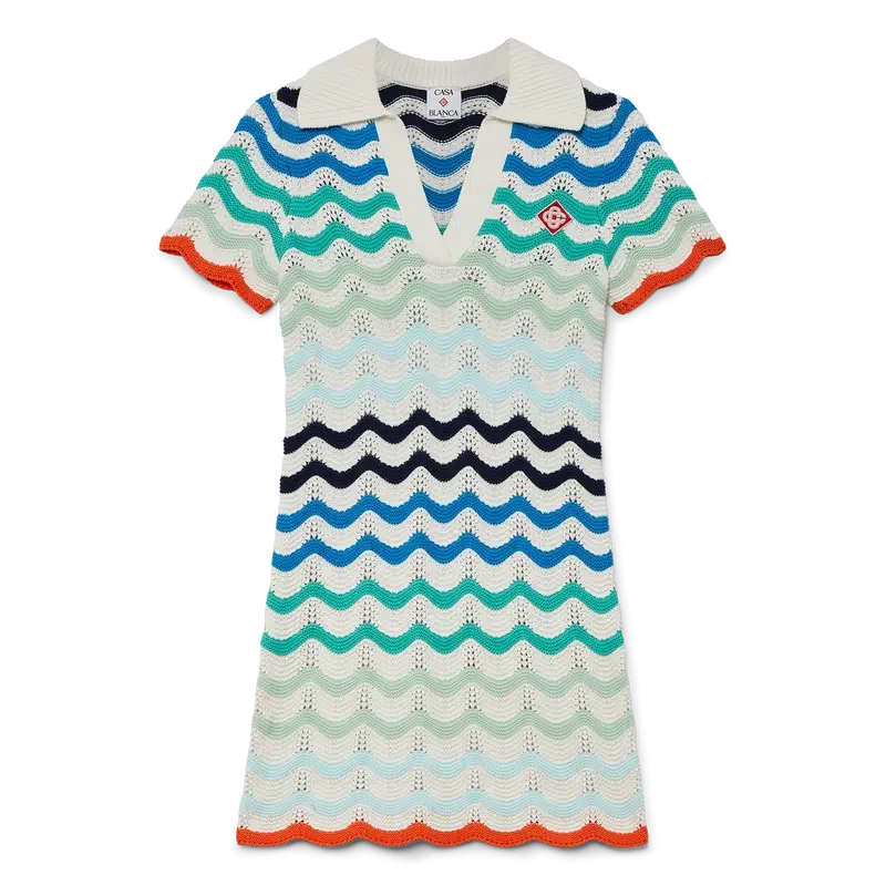Das Gradient Wave Crochet Kleid ist ein kurzärmeliges Minikleid aus gehäkelter Baumwolle mit dem vom Memphis-Stil inspirierten Designelement des Hauses in Farbverläufen. Abgerundet durch einen V-Ausschnitt, einen Kragen und kontrastierende Kanten an den Ärmelbündchen und am Saum.