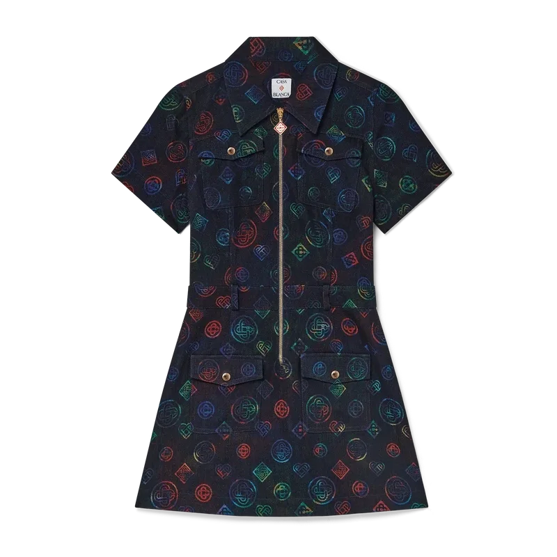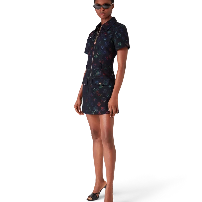 Das Heatmap Monogram Denim Kleid ist ein kurzärmeliges A-Linien-Minikleid aus Baumwoll-Denim mit dem charakteristischen Heatmap-Motiv der Saison. Es verfügt über einen Frontreißverschluss mit dem markentypischen Reißverschlussschieber mit Diamond Monogram, Gürtelschlaufen, Pattentaschen und vergoldeten Metallbeschlägen mit Markenlogo.