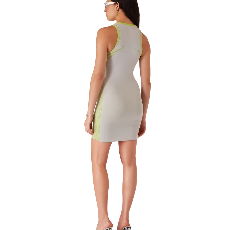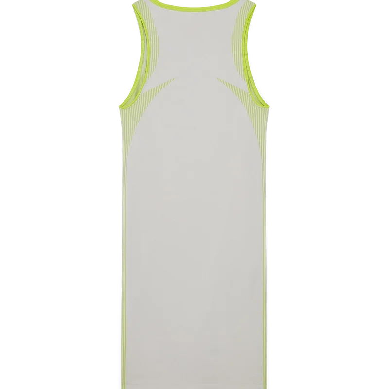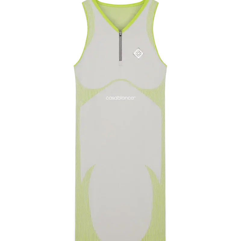 Das nahtlose Kleid ist ein ärmelloses, figurbetontes Modell mit dem silbernen Diamant-Logo des Hauses und dem Casablanca-Logo in der Mitte. Abgerundet wird es durch einen flachen V-Ausschnitt, einen Reißverschluss mit der charakteristischen Diamant-Reißverschlusslasche des Hauses und Einsätze für zusätzlichen Halt.