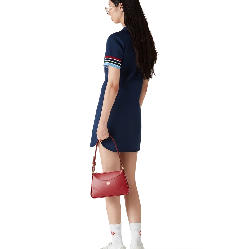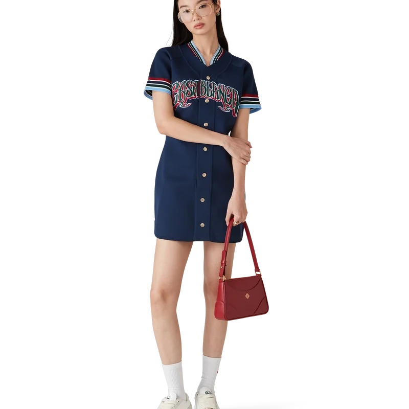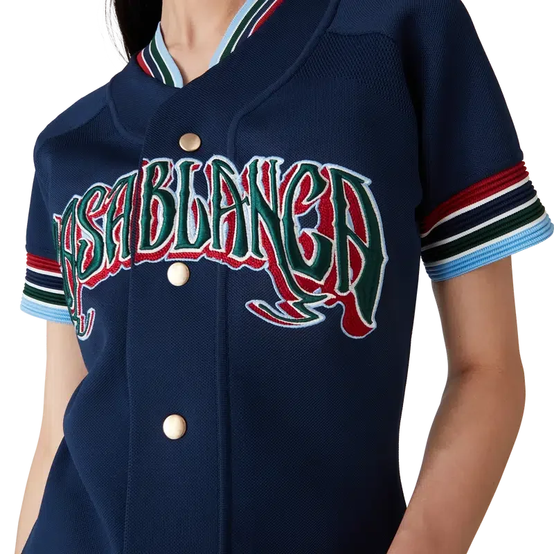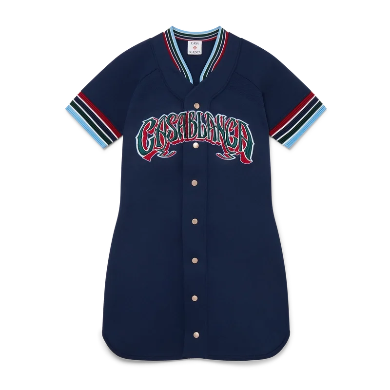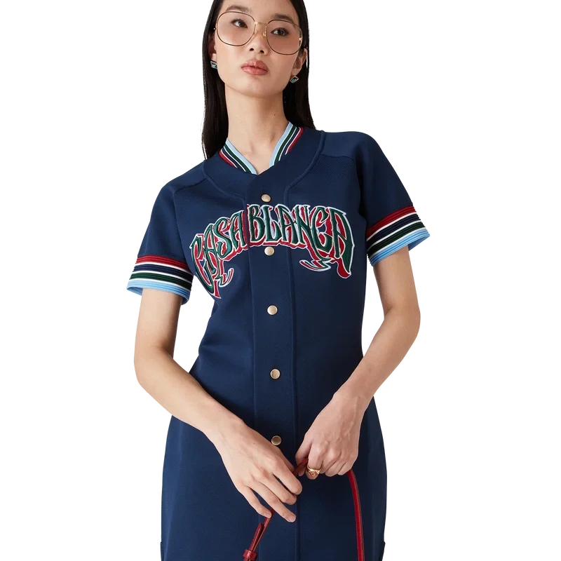 Das gestrickte Baseball-Kleid ist ein Minikleid aus Strickstoff mit einer gestickten, handgezeichneten Schrift des Casablanca-Logos, inspiriert von der in Tattoos verwendeten Gothic-Schriftart. Abgerundet durch einen Knopfverschluss, vergoldete Druckknöpfe mit Markenlogo, kontrastierende rote, weiße, marineblaue, grüne und blaue Streifen an den Ärmelbündchen und am Kragen sowie einen abgerundeten Saum.