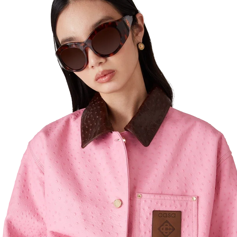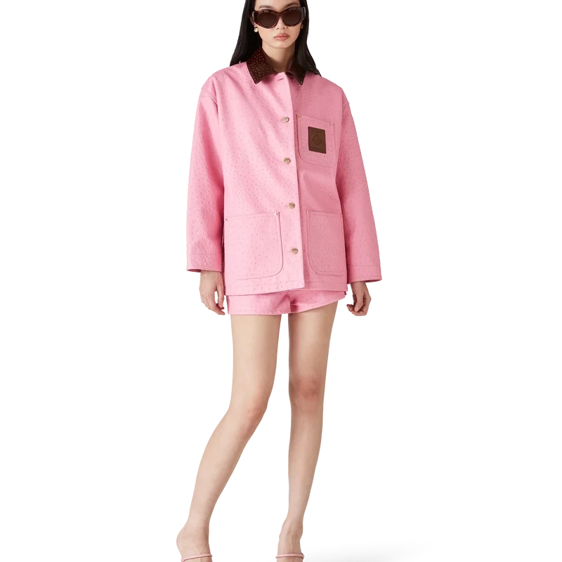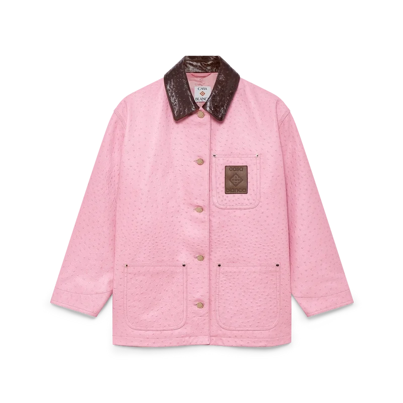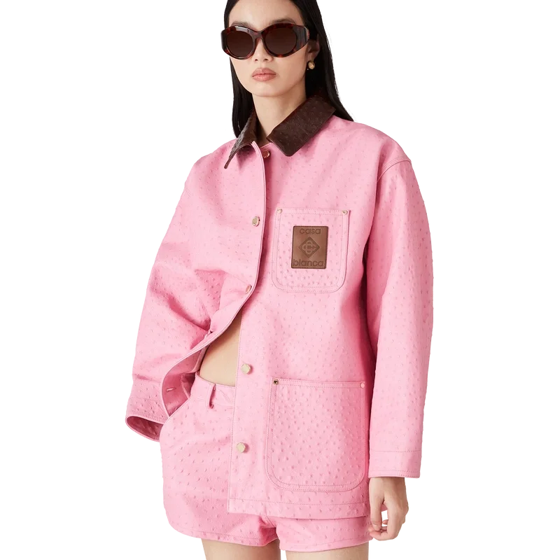 Der Arbeitsmantel aus geprägtem Leder besticht durch sein lockeres, lässiges Design und ist aus italienischem Kalbsleder gefertigt. Er verfügt über ein aufgedrucktes Muster im Straußenleder-Look, einen kontrastierenden Kragen, eine Brusttasche mit einem Lederpatch mit Markenlogo, aufgesetzte Vordertaschen, einen Knopfverschluss sowie vergoldete Beschläge.