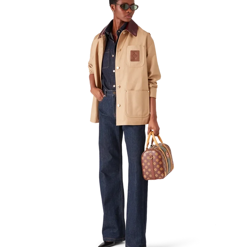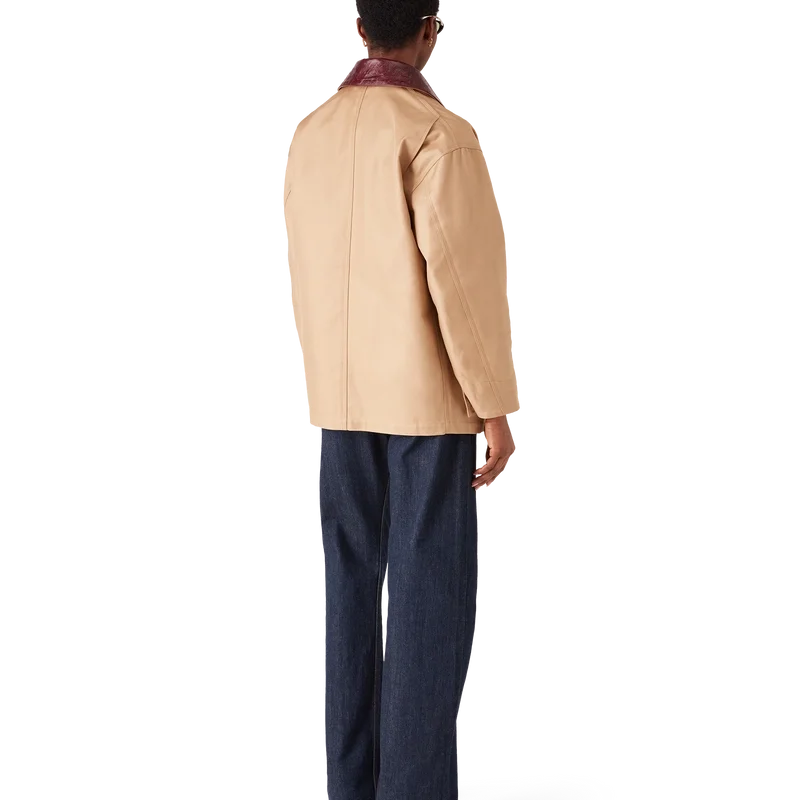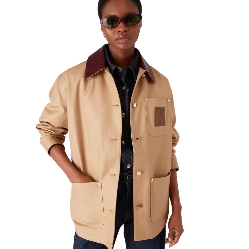 Die beige Arbeitsjacke ist ein langärmeliges, lässiges Design aus Baumwoll-Drillich, das funktionale Elemente durch die gehobene Optik des Hauses neu interpretiert. Mit Kontrastkragen, einer Brusttasche mit Marken-Lederpatch, aufgesetzten Vordertaschen, Knopfverschluss und vergoldeten Beschlägen.