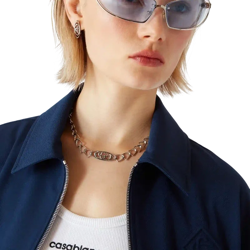 Die marineblaue Anzugjacke aus Wolle ist ein sportlich-elegantes Design aus einem Wollmischgewebe, das den raffinierten Ansatz des Hauses bei der Anzuggestaltung widerspiegelt. Mit Reißverschluss mit Diamond Monogram-Reißverschlusszug, spitzem Kragen, seitlichen Paspeltaschen, Saumdetail mit Casablanca-Logo und gestreiften Kanten.