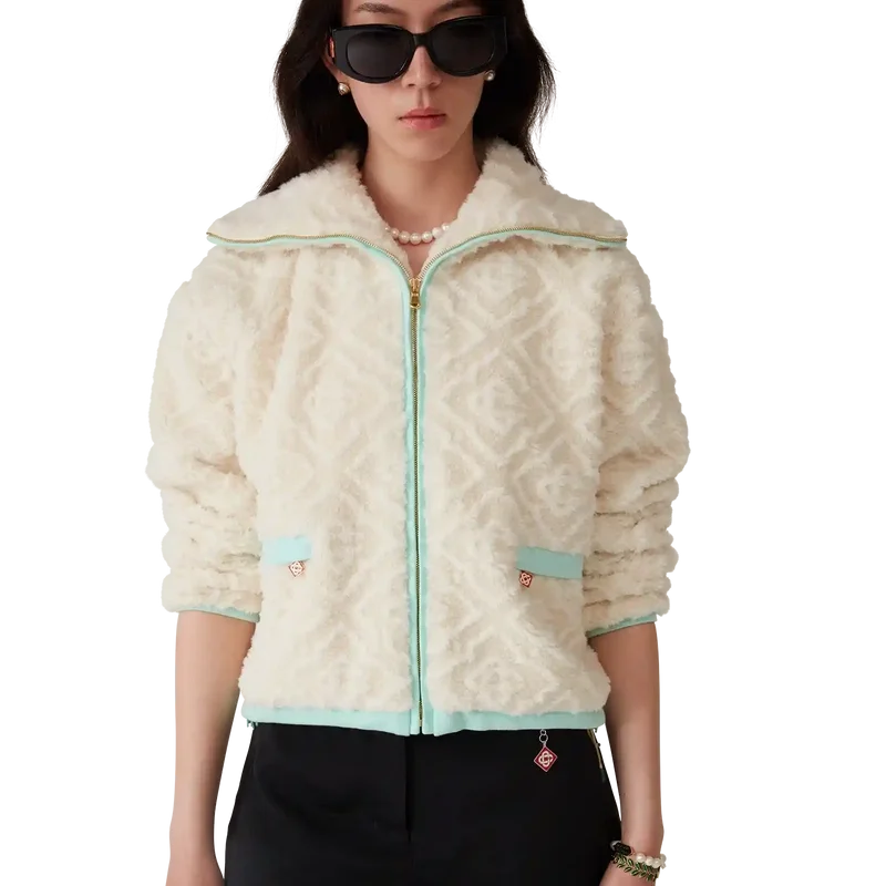 Die Monogram Jacquard Fleece-Jacke ist ein langärmeliges Modell mit weicher Textur aus Fleece-Stoff. Sie verfügt über einen Trichterkragen, einen Reißverschluss mit dem charakteristischen Diamant-Logo des Hauses am Reißverschlusszug, pastellfarbene gerippte Bündchen, Saum- und Kapuzenranddetails sowie Taschen mit Reißverschluss.