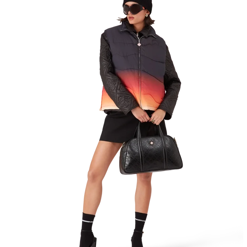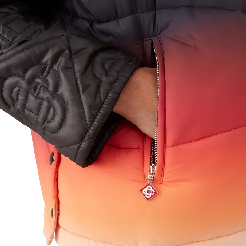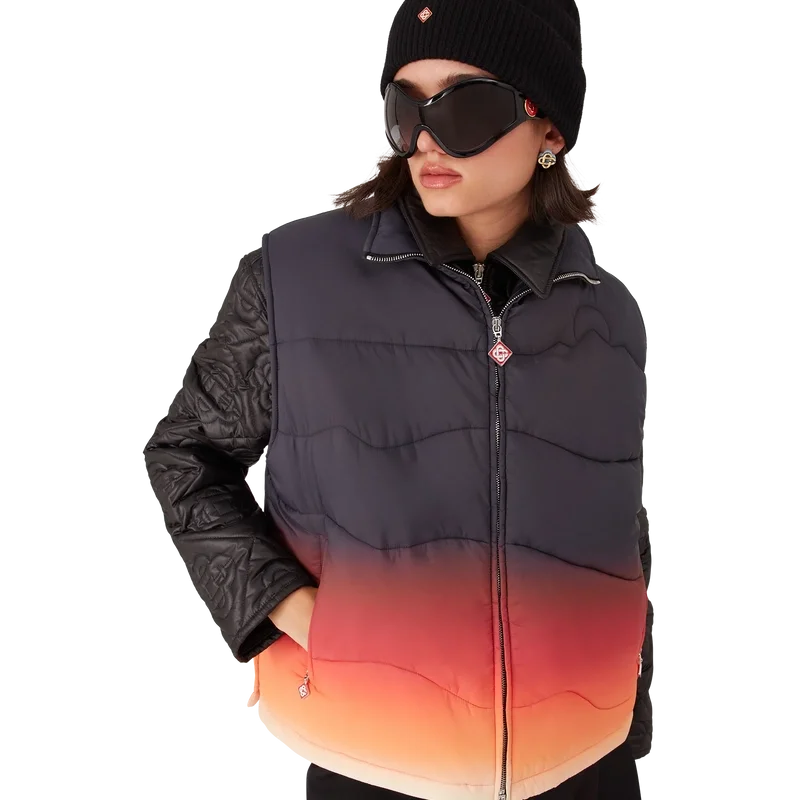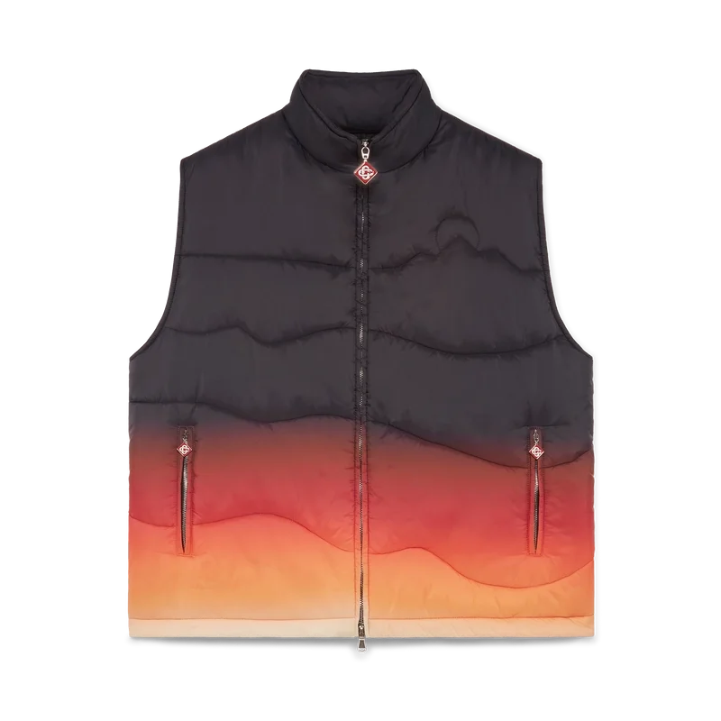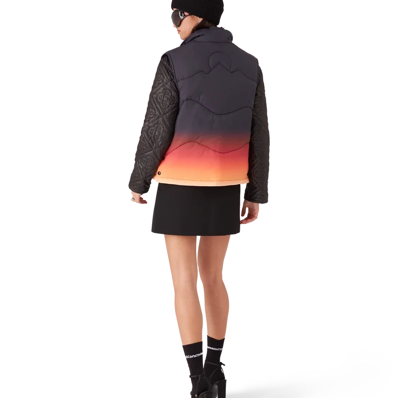 Die Gradient Nylon Puffer Gilet ist ein raffiniertes Design für Oberbekleidung aus Nylonstoff mit Farbverlauf, inspiriert von den atemberaubenden Farbverläufen bei Sonnenaufgang und Sonnenuntergang über Japans schneebedeckter Landschaft. Sie erinnert an spektakuläre Momente, in denen ein leuchtender Himmel die ländliche Berglandschaft erhellt und Dörfer vor einer dramatischen alpinen Kulisse erstrahlen.