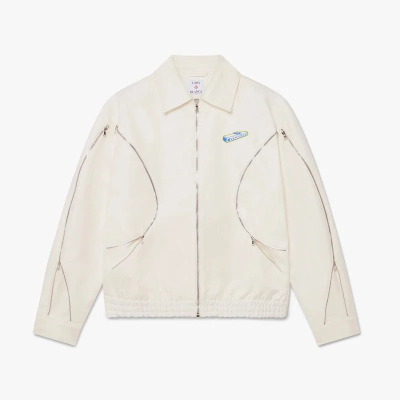 Die weiße Baumwoll-Drill-Jacke mit Reißverschluss ist ein raffiniertes Design aus strapazierfähigem Baumwoll-Drill-Stoff in strahlendem Weiß. Sie verfügt über einen Reißverschluss mit dem Warped-Logo-Reißverschlusszug des Hauses, einen spitzen Kragen, Vordertaschen mit Reißverschluss, Reißverschlussdetails an den Ärmeln und eine lockere Silhouette, die den Sport- und Freizeit-Stil des Hauses verkörpert.
