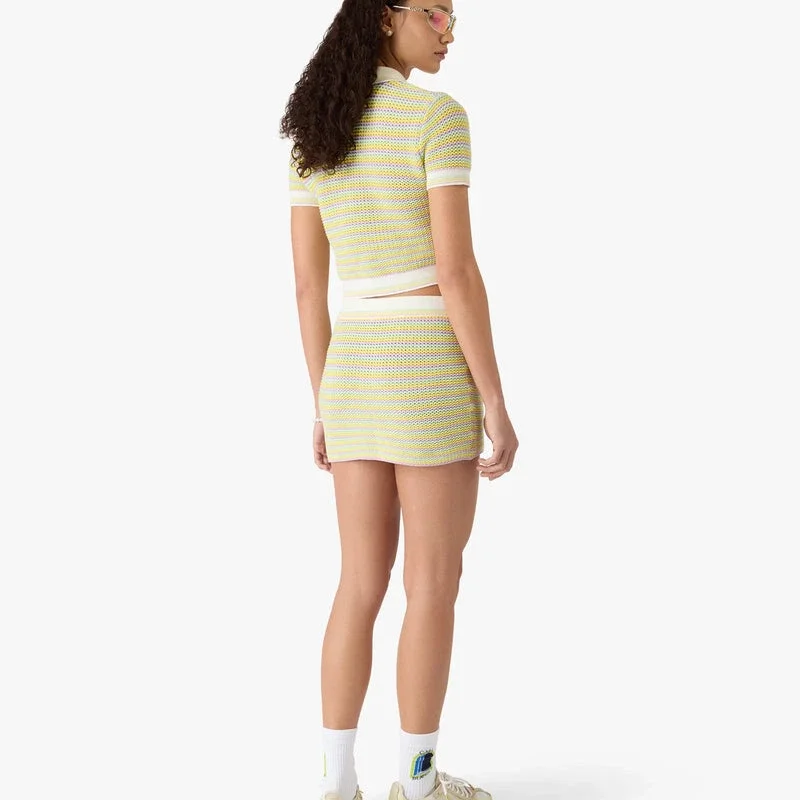 Das gestreifte Poloshirt von Bourgeois ist ein raffiniertes Strickdesign mit eleganten horizontalen Streifen. Es verfügt über einen Knopfverschluss, einen kontrastierenden gerippten Kragen, eine Knopfleiste sowie Details an Manschetten und Saum, silberrandige Emaille-Knöpfe und das versilberte Warped-Logo des Hauses. Die taillierte Silhouette verkörpert den gehobenen Ansatz des Hauses in Sachen Strickwaren.