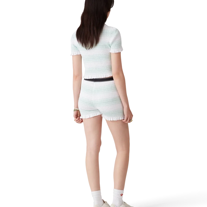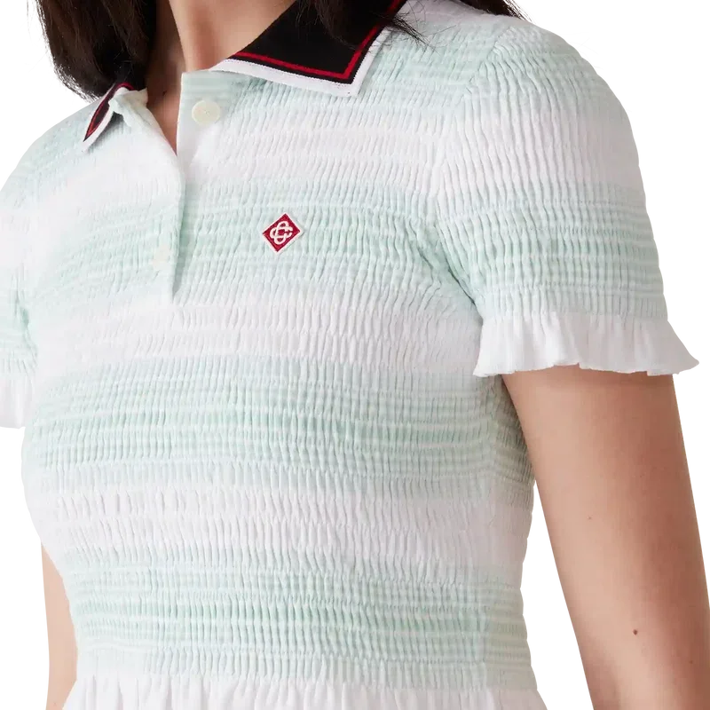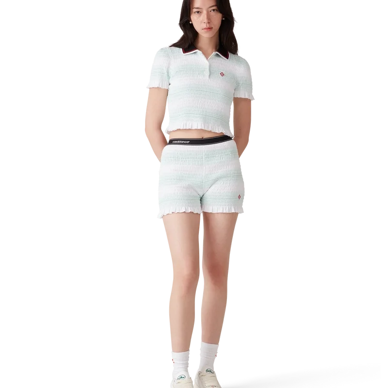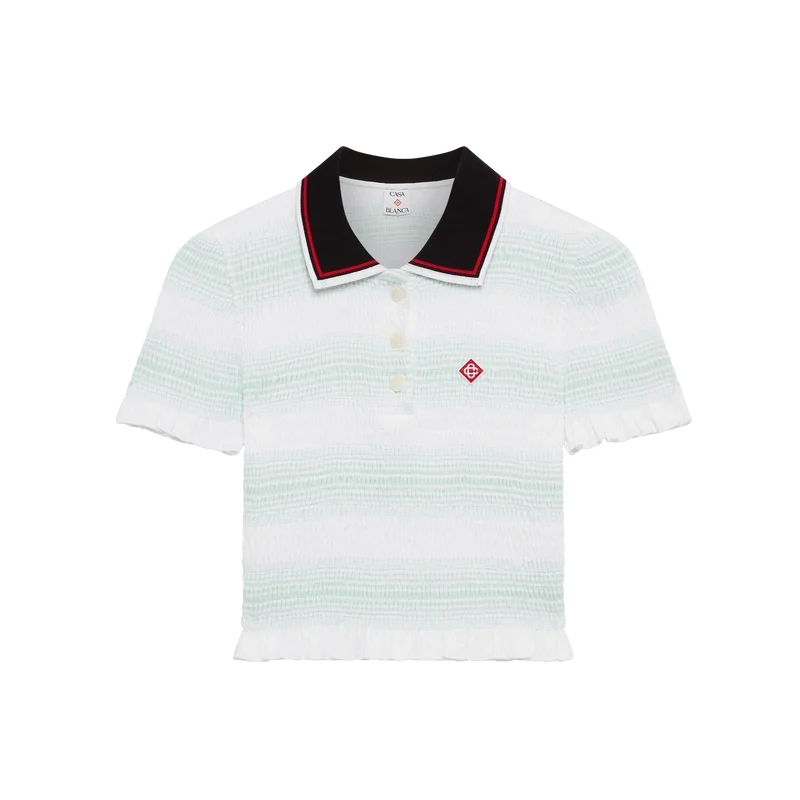 Das gestreifte, geraffte Poloshirt ist ein kurz geschnittenes Modell mit dem charakteristischen Rautenlogo des Hauses. Es ist aus gerafftem Baumwollstoff gefertigt und verfügt über einen gerippten Kragen mit gestreiften Kanten, eine Knopfleiste mit drei Knöpfen, kurze Ärmel sowie Rüschen an den Ärmelbündchen und am Saum. Es ist so geschnitten, dass es oberhalb des Bauchnabels sitzt.