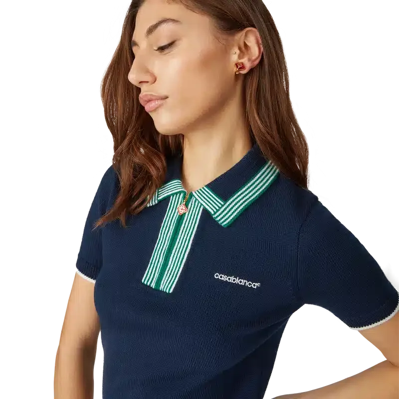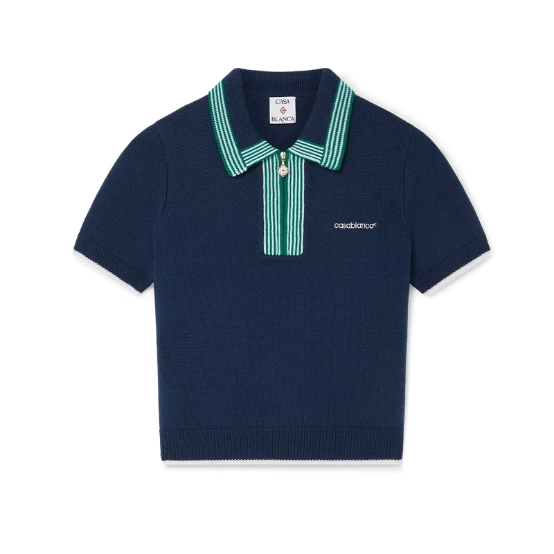 Das gestrickte Tennis-Poloshirt ist ein klassisches Design aus Merinowolle. Mit kontrastierenden Rippbündchen an Ärmeln, Saum, Kragen und Knopfleiste, Reißverschluss vorne, Rippkragen und Casablanca-Logo.