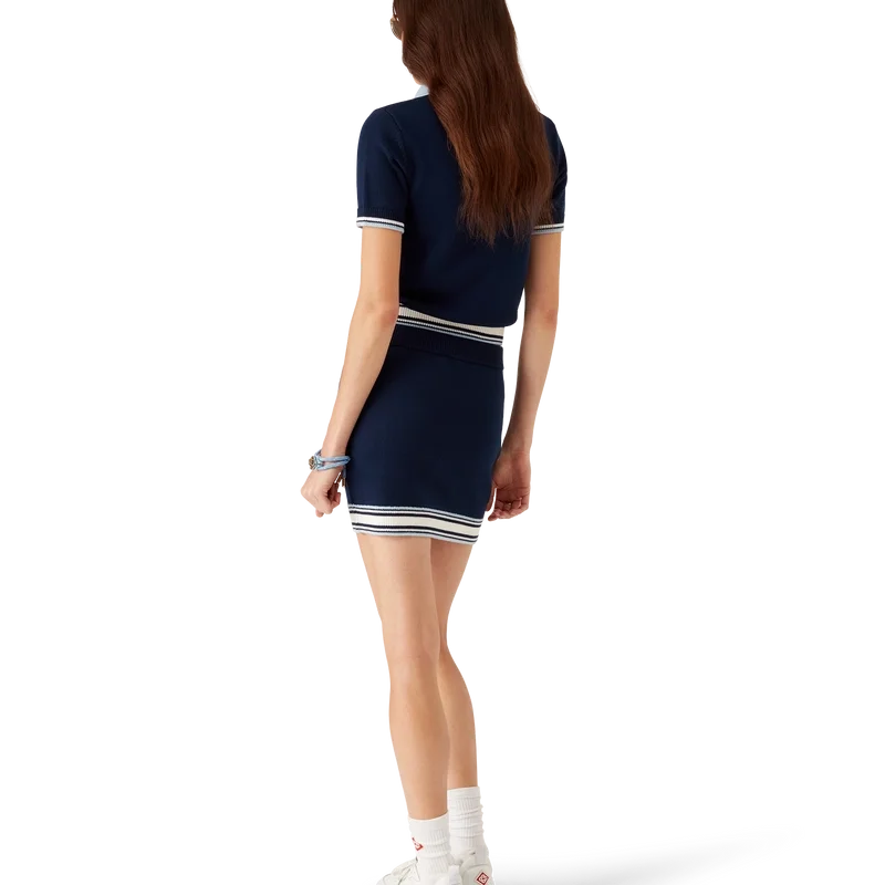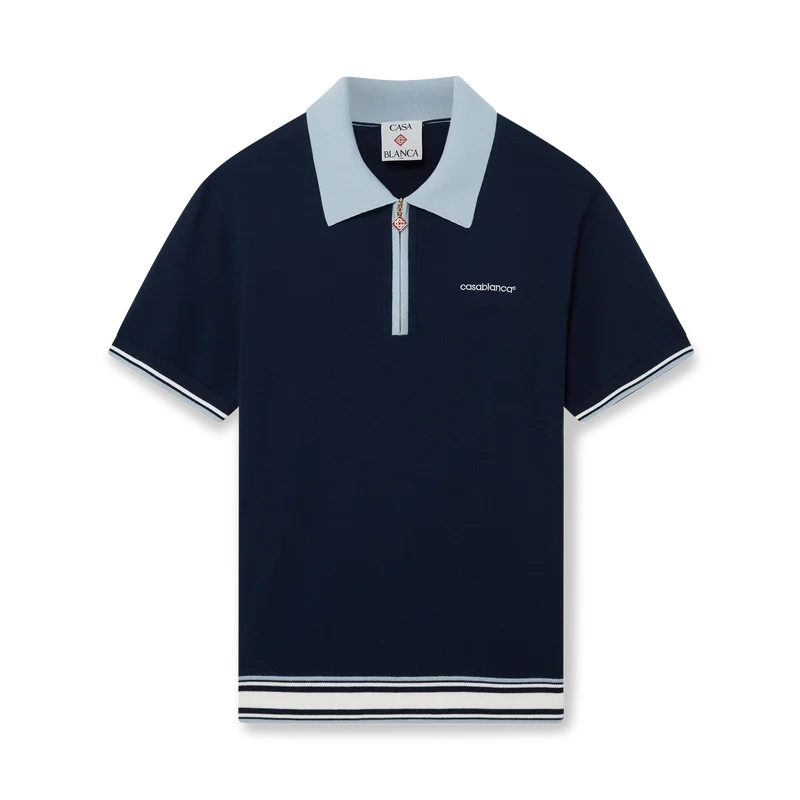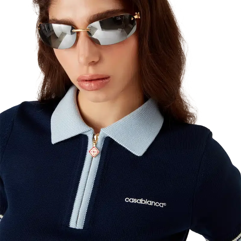 Das Merino-Strick-Tennis-Poloshirt ist ein kurzärmeliges Modell aus Merinowolle. Es verfügt über einen Reißverschluss, einen Reißverschluss-Zipper mit dem charakteristischen Diamant-Logo, gestreifte Details an Saum und Manschetten, einen kontrastierenden gerippten Kragen und eine Knopfleiste sowie das Casablanca-Logo des Hauses.