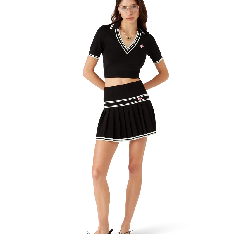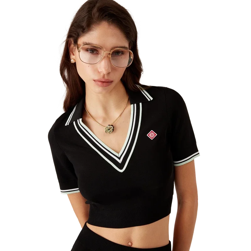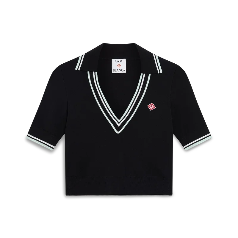 Das Viskose-Poloshirt mit V-Ausschnitt ist ein kurz geschnittenes Modell aus Strickstoff mit dem charakteristischen Rautenlogo des Hauses. Es verfügt über einen gerippten Kragen, Ärmelbündchen und Saum mit kontrastierenden grün-weißen Streifen sowie einen tiefen V-Ausschnitt.