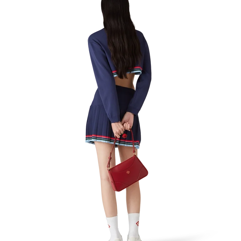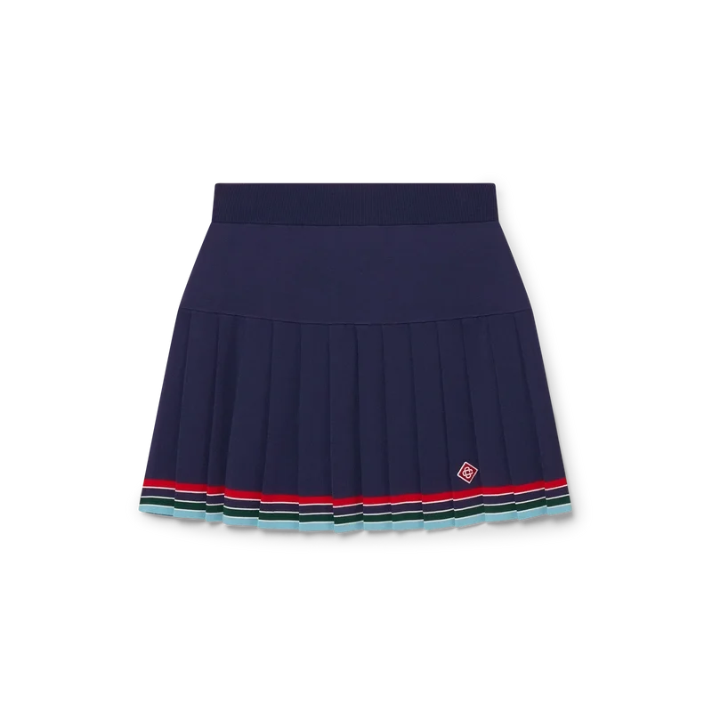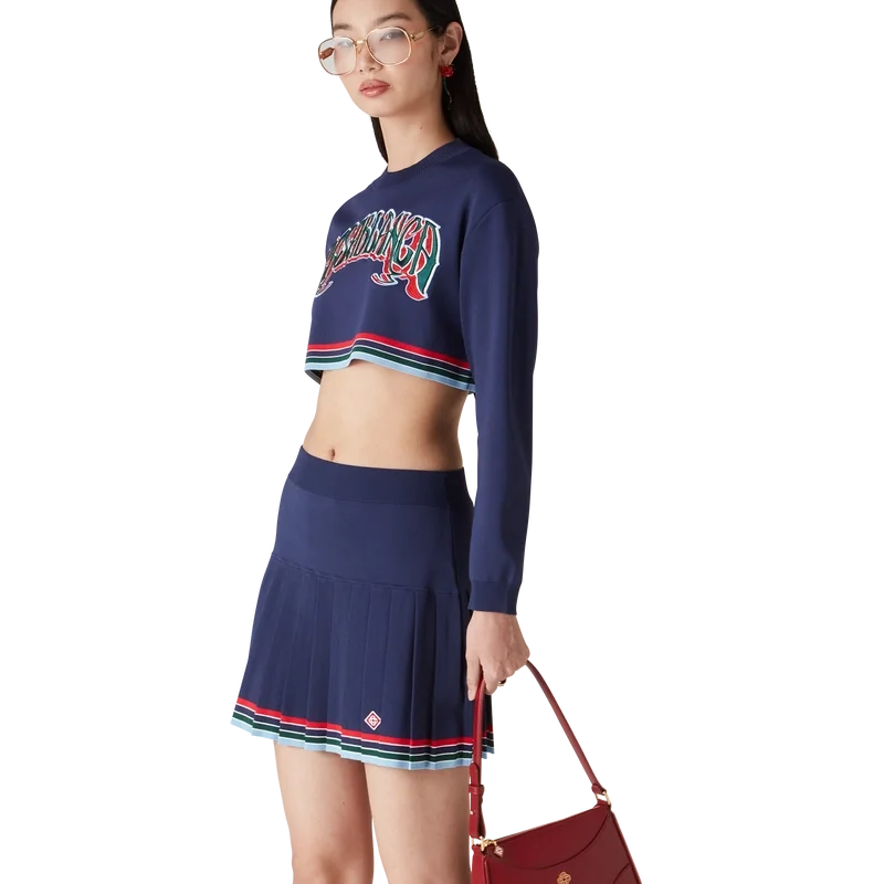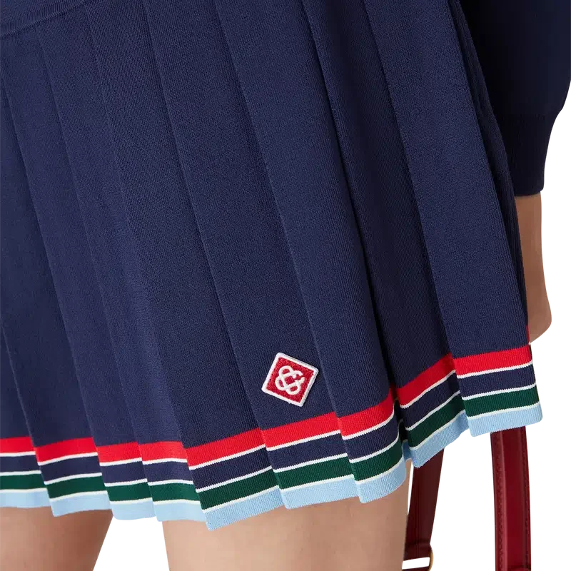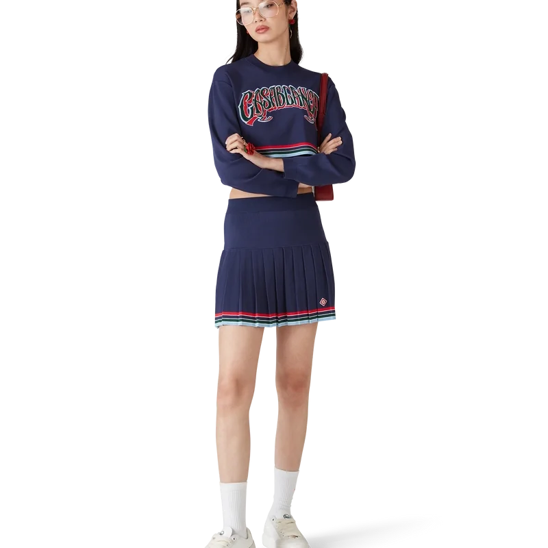 Der Baseball-Faltenrock ist ein Minirock aus Trikotstoff. Er verfügt über einen Bund, Falten und ein Detail aus roten, weißen, blauen, grünen und marineblauen Querstreifen am Saum.