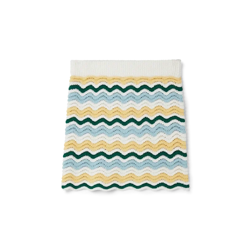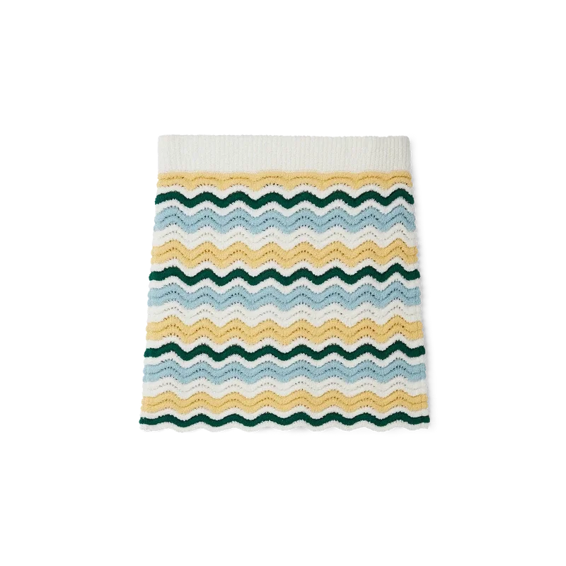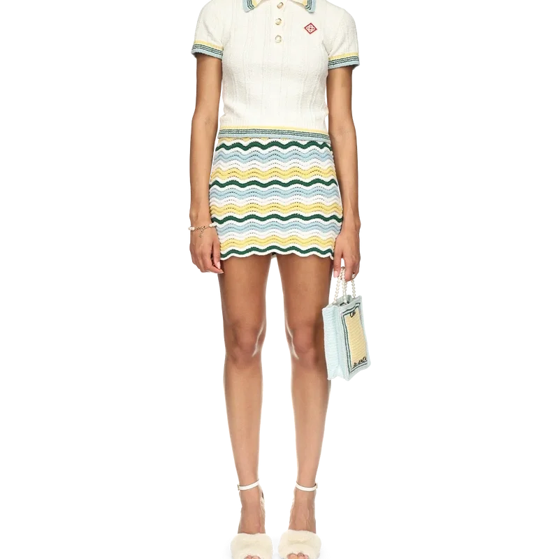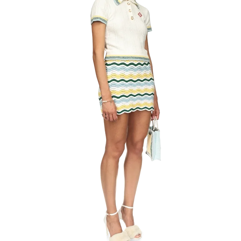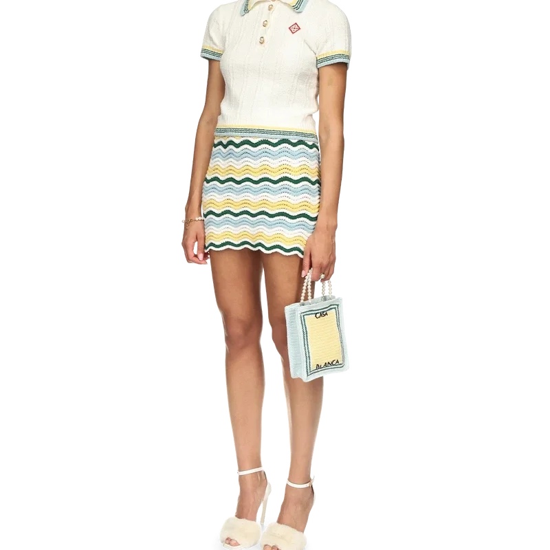 Der Boucle-Wellenrock ist ein typisches Casablanca-Modell aus einem weichen, strukturierten, offen gewebten Häkelstoff. Der mit unserem Casablanca Paris-Markenlabel und einem elastischen Bund versehene Strickstoff aus einer Baumwoll-Nylon-Mischung ist so geschnitten, dass er in der Taille sitzt und mit einer schmalen Passform bis hin zu einer Minirocklänge getragen werden kann.